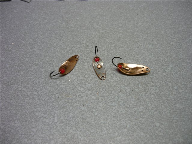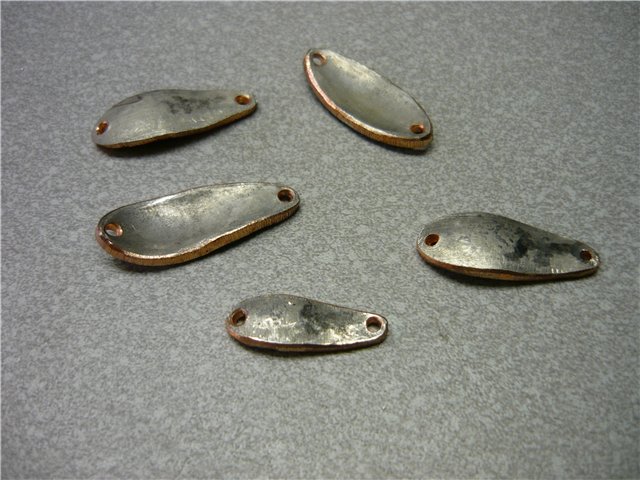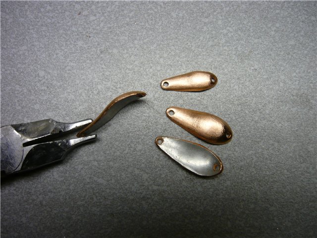 Гоняем блёсенки в ванной, если игра не устраивает, корректируем геометрию или уплощая,постукивая молотком, положив на наковальню, или выгибая шаром в свинце. Гоняем, пока не добьёмся необходимого результата. Сразу может не получиться и на пятый раз может не получиться (сколько я в своё время металла перепортил...), но если будет желание - получится ОБЯЗАТЕЛЬНО, даже не сомневайтесь, потом ещё и меня учить будете. Окончательная проверка уже с заводными кольцами и крючками. В принципе, можно уже ловить, но ведь это УЛЬТРАЛАЙТОВЫЕ блёсны, а значит, должны быть красивыми, по умолчанию.