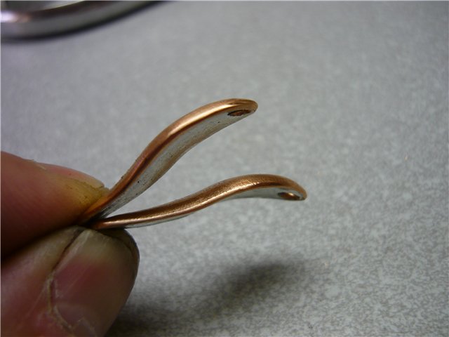 Для изготовления вертушек обычно пользуюсь покупными хомутиками. Но, если срочно надо, а в магазин ехать неохота или нет нужного размера, то можно изготовить и самостоятельно. Порывшись в интернете можно найти много способов изготовления, я ничего нового не дополню, просто попробую проиллюстрировать. Самые простые можно сделать из медной проволоки. Делаем необходимый изгиб, прикладываем к проволоке (воображаемой оси блесны) и откусываем кусачками лишнее, разгибаем проволоку и получаем образец необходимой длины. Заготавливаем необходимое кол-во. Затем плоскогубцами (или молотком на наковальне) расплющиваем концы проволоки.