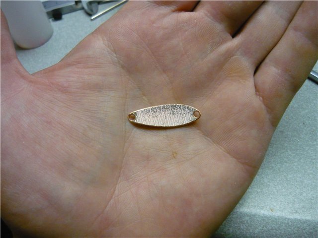 Делать это надо очень осторожно, чтобы сохранился внутренний прогиб по всей длине блесны, в этом свинец очень помогает. Получаем уже что-то похожее на блесну.