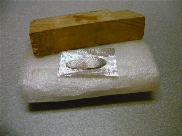 Кладём на ровную поверхность наковальни тисков выпуклой стороной вверх и осторожно постукивая молотком слегка распрямляем. Для придания наружного изгиба я кладу заготовку на свинец и шаром нужного размера потихоньку выбиваю нужный радиус.