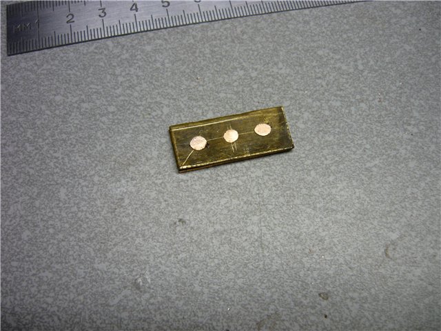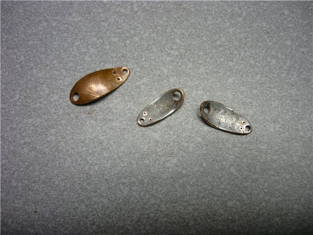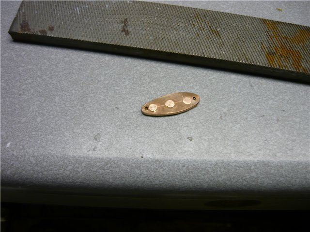 Определяемся с размером. В соответствии с этим делаем две заготовки, в данном случае - медь и латунь. В одной заготовке сверлим по краям отверстия под заводные кольца, одно по центру и по одному между центральным и заводными - для заклёпок. Во второй заготовке сверлим пока только одно отверстие по центру. Зенкуем под шляпки заклёпок. Вствляем в центральное отверстие заклёпку, соединяем пластины и склёпываем. Через уже просверленные отверстия в одной заготовке сверлим, как по кондуктору, отверстия во второй, зенкуем, вставляем заклёпки и клепаем. Придаём заготовкам очертания будущей блесны. По технологии, описанной выше, штампуем колебалку необходимой нам геометрии.