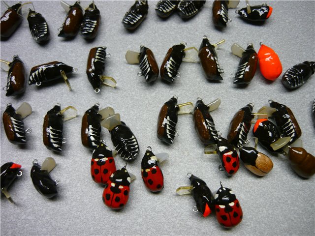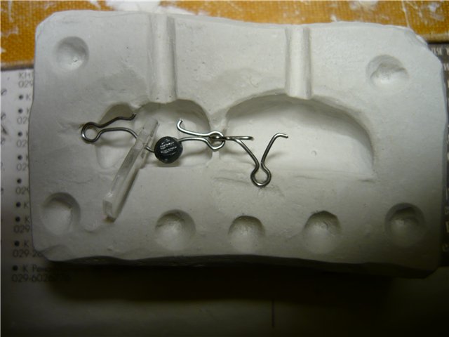 Делаем форму по технологии, аналогичной рассказанной ранее о воблерках. Получаем плавающего пенополистиролового жука. Из проволоки делаем петли и выбрав нужное место для них, вставляем в наш воблерок. Если предполагается сделать жучка с лопаткой как у воблера, то делаем прорезь под лопатку, заполняем её пластилином и подбираем лопатку нужного размера и формы. С помощью пластилина фиксируем необходимый наклон лопатки. Тестируем в ванной. При необходимости делаем огрузку свинцовыми дробинками. Я наношу тонкую полоску пластилина или липкого воска вдоль брюшка и подбираю размер и место для огрузки. Добившись в ванной необходимой игры, запоминаем размер и место огрузки, аккуратно заглаживаем пластилин вокруг лопасти и делаем из самотвердейки уже окончательную рабочую модель с лопастью (если надо) и петлями. Делаем, теперь уже рабочие гипсовые формы, вставляем в них лопатки (если есть возможность, можно нарезать лазером) и проволочный каркас с огрузкой .