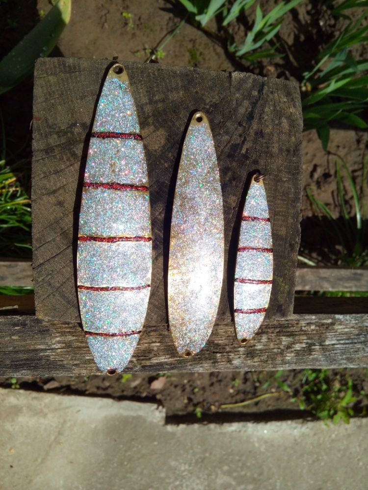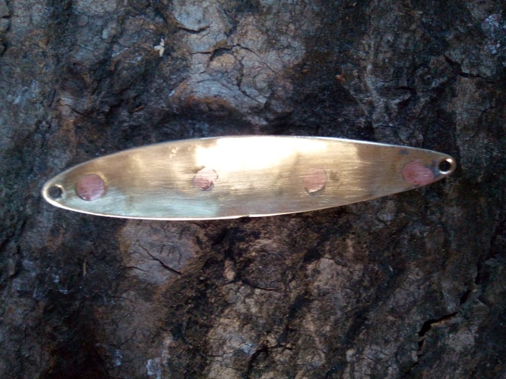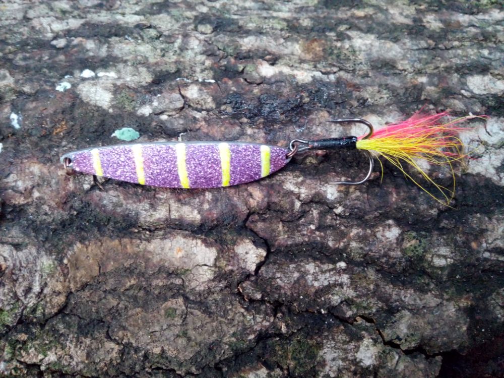 Добрый день. Попробовал сделать максимально дешевую колебалку из подручный средств. Собрал пакет: пластина латуни 0.4мм, три пластины оцинкованного профиля около 0.4 мм толщиной. Спаял (залудил всю поверхность, сжал двумя струбцинами между двух металлических пластин, нагрел на газу), закрепил самодельными заклепками из медной проволоки. Выглядит топорно, возможно из заводских заклепок вид будет лучше. Просто пайка при последующем выгибании разлетается. Обработал по форме, выгнул. Оцинкованную поверхность покрыл глиттером: фиолетовый обычный, полоски из желтого флуоресцентного. Длина блесны 68 мм. Поверх глиттера акриловый аэрозольный автолак два слоя.