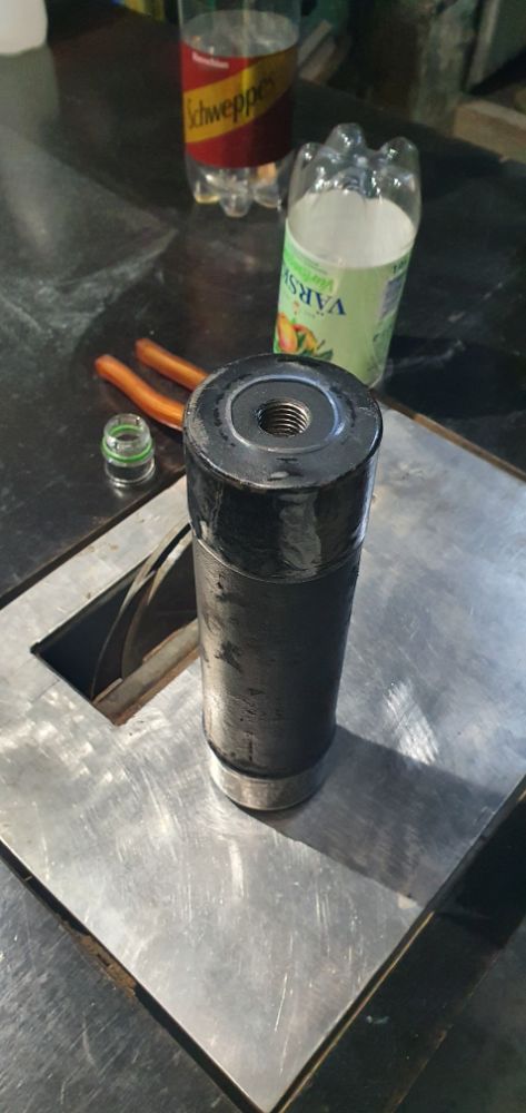 Подвернулся палец стальной с резьбой м16 в торце, я его облогородил и сверху и снизу на него осадил пет бутылки дно и горлышко.Далее обмотал широкой, чёрной изолентой и сверху снова бутылку фнном осадил, нехватило, пришломь еще кусочек прихренячить, затем вкрутил рым на резьбовом герметике. Жду когда он меня порадует, а то уже собрался из корпуса огнетушителя на 1кг делать.