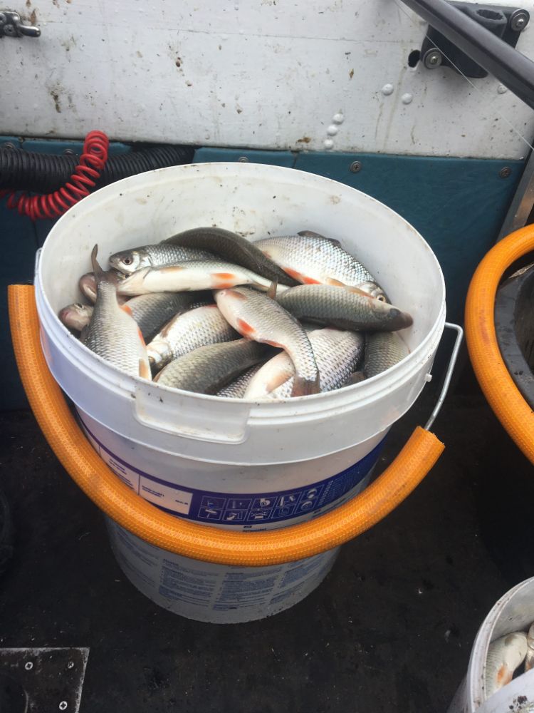 Товарищ взял пару вимб, ну и взяли по хорошему окуню. Плотва разная, но в восновном крупная. В 16 отчалили до дому.