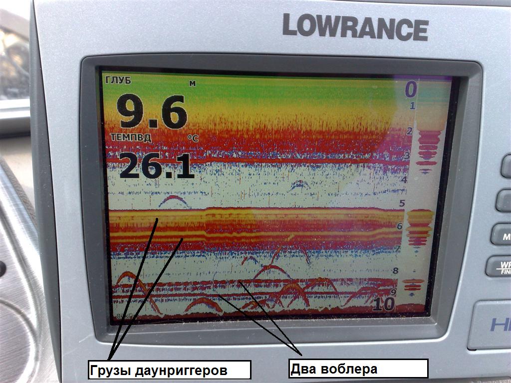 При ловле с даунриггерами настроили снасти таким образом, что теперь в эхолоте видно не только дно, но и приманки на его фоне. Теперь можно не держать в голове собственное заглубление воблера, вот дно, а вот воблер. Дёргай его куда хош!