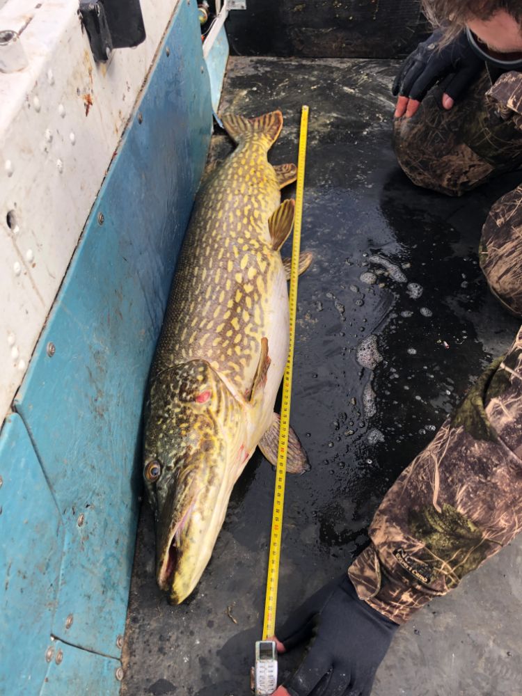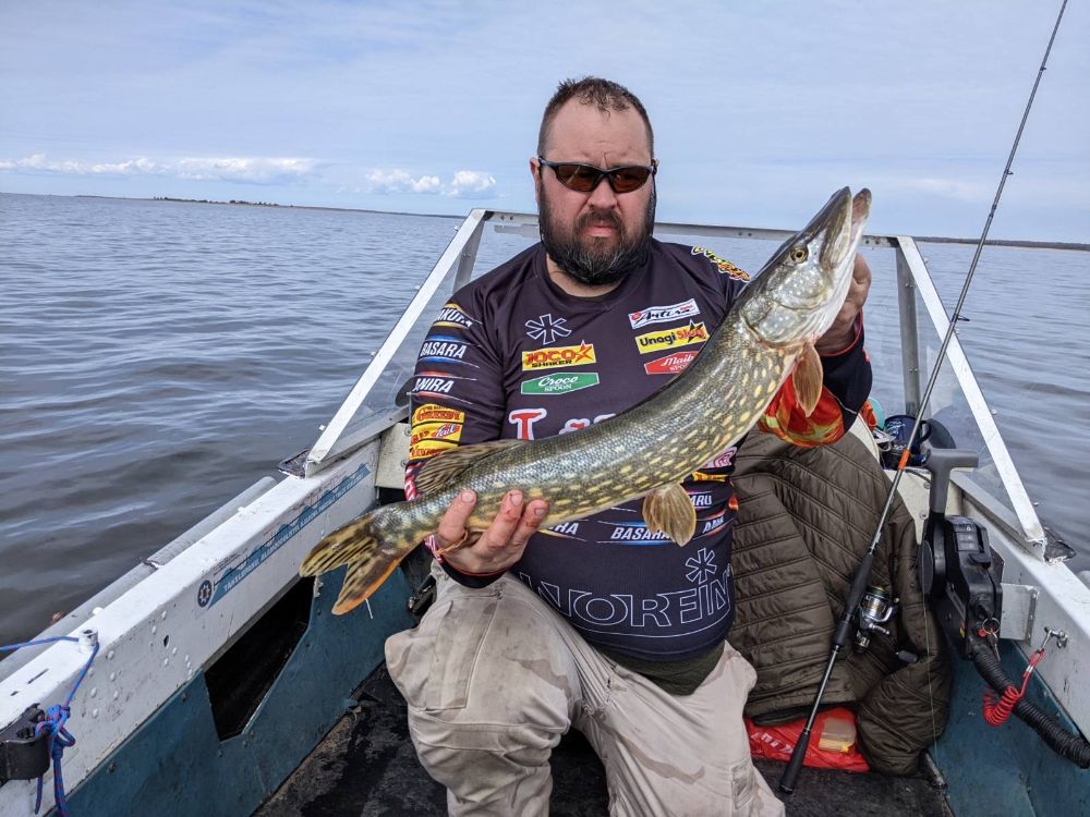В субботу, дабы скоротать день до открытия щучьего сезона, сгонял на Рейу в верховья, накидал полведра красивой плотки и взял четыре крупные вимбы. К обеду завершил это дело ибо клев сошел на нет и терпение кончилось. Собрал щучьи снасти, загрузил все в лодку, сгоняли с другом в магазин, затарили выпить-закусить и поехали на берег моря, где нас уже ждал наш третий камрад Эрки. Слипанулись и заселились в кемпинг, разговоры, шутки и стаканы позволили скоротать время и дождаться второго экипажа. Так впятером и просидели почти до полуночи. Утром неспешно собрались и около 7 вышли на воду. Давно не помню на этом водоеме такого быстрого открытия по рыбе - первая щукп поднялась на борт в первые полчаса. Пришла за приманкой Алексея, но развернулась, и на втором забросе я ее доловил. Далее было много провожалок, но брать не хотела. Эрки сегодня был на своей лодке и выгуливал двух своих товарищей, которые попросились на рыбалку. Их точка оказалась очень крутой - на троих они с места подняли около 20 рыб и ещё видели кучу догонялок и сходов. Самая большая у них потянула на 7,8кг. Мы приехали туда же, встали поодаль, сначала тишина, а потом Алексей поднимает на борт 103см - не взвешивали, но на глаз 8кг+. Я на точке поимел один сход и одну околотрешку забрал. Потом у нас был обед, разговоры, сборы и дорога домой.