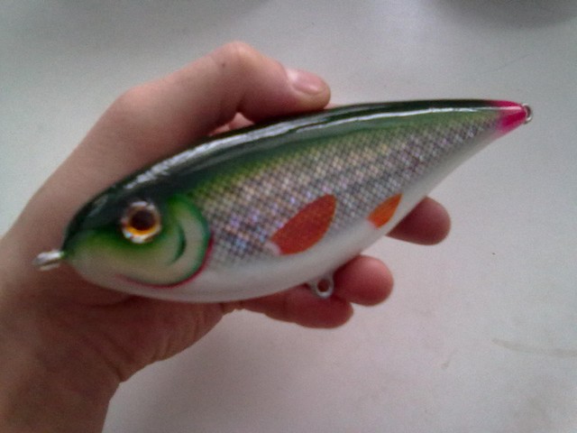 В общем испытания прошли успешно, на вертикальном поднятии почти от оси не отклоняется, на медленном падении если не сдерживать натяжением, то будет сильно уходить в сторону, по прикидкам на глубине пару метров на метр-полтора от оси, может и больше в зависимоти от потяжки. Как джерк получилась игра еще симпотнее, гуляет в стороны шо чертик в табакерке)))