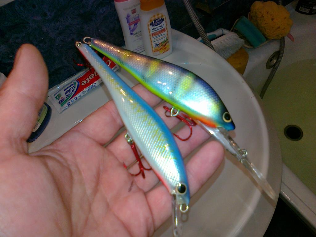 Естественно никакого влияния маятниковой вставки в ванной не почувствовал. Да, напомню, дайвер без доп.огрузки, огружен только маятниковым весом, а твичинговый имеет латунный прут в заднице. И ещё, возможно кому-нибудь пригодится, грязно-голубой цвет спины одного из воблеров, это некогда красивый прозрачный фиолетовый