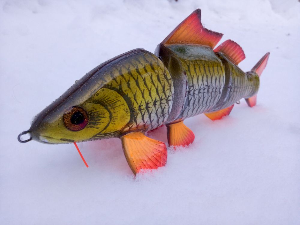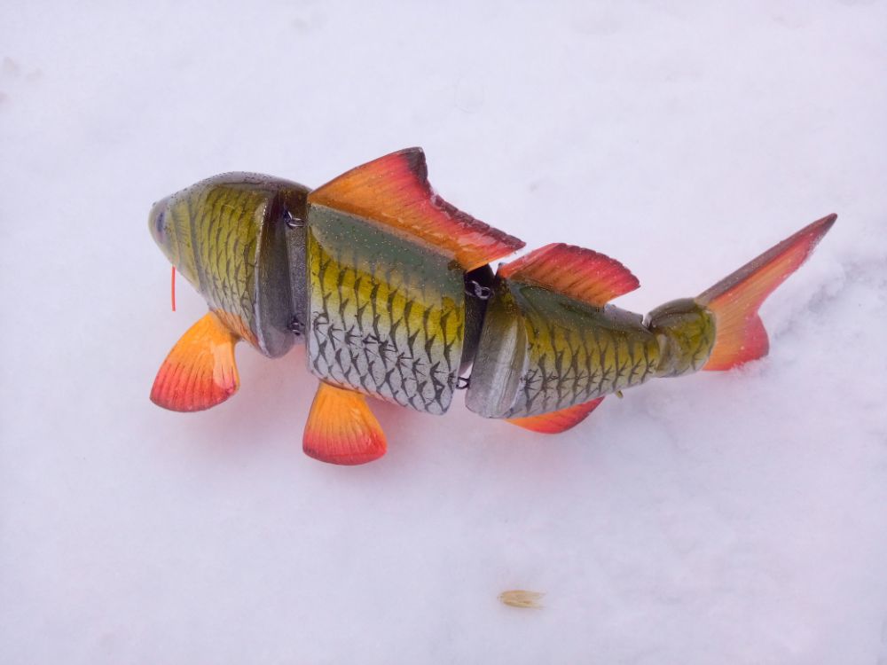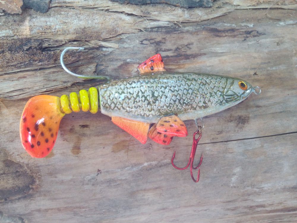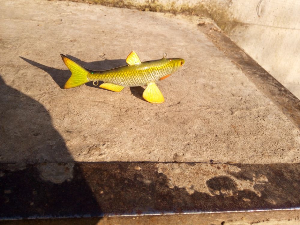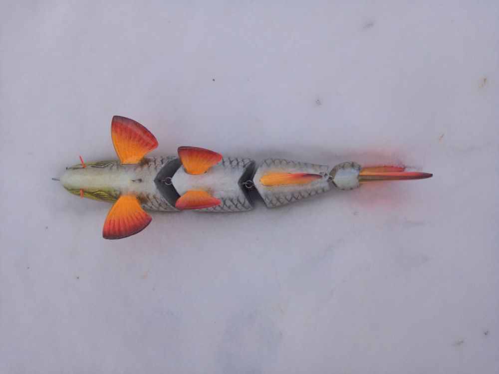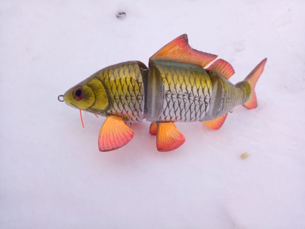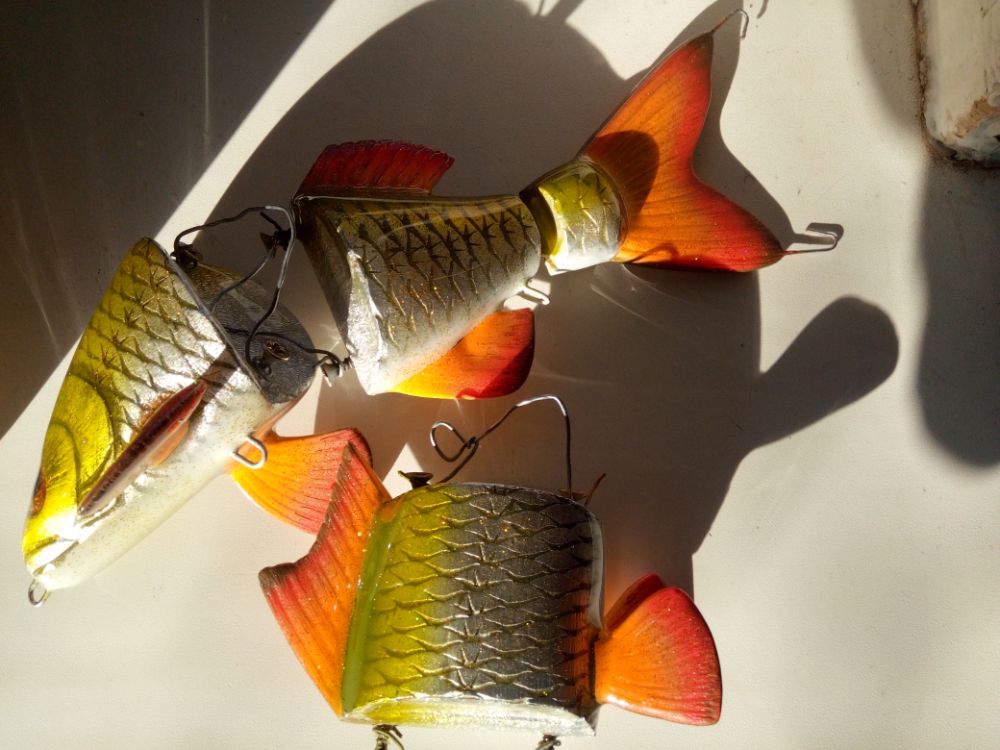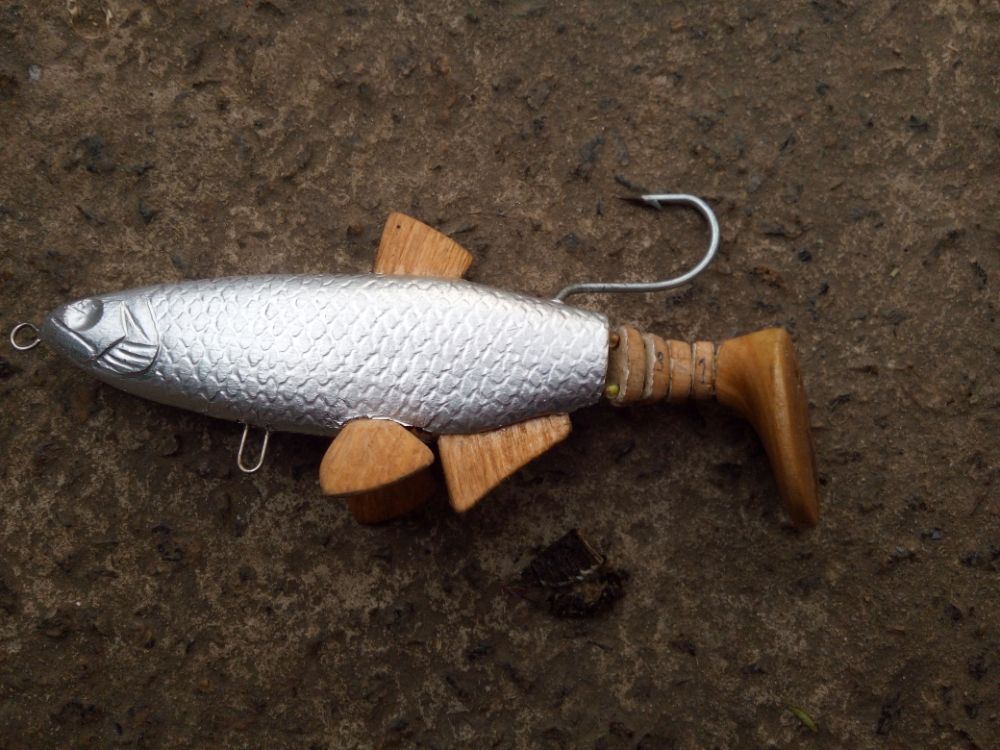 Добрый день. Результат воплощения еще одной идеи. Хотелось бы создать деревянную "силиконку". пока полученные результаты далеки от желаемого. Игра хвоста получилась слабая, скорее всего влияет вариант сборки на двух нитках. Все таки у силиконки хвост играет не из стороны в сторону, а как бы скручивается, при данном варианте сборки скручиваение сильно ограничено. В дальнейшей работе попробую собрать на одной нитке. Огрузку делал ближе к носу, для наклонного положения в воде, но не учел плавающий хвост, который "опрокидывает" приманку почти до вертикального положения. Думаю, что оптимальное расположение огрузки в районе плавников. Также для получения большей стабильности огрузку попробую располагать ниже (в этой приблизительно 5мм от нижнего контура).