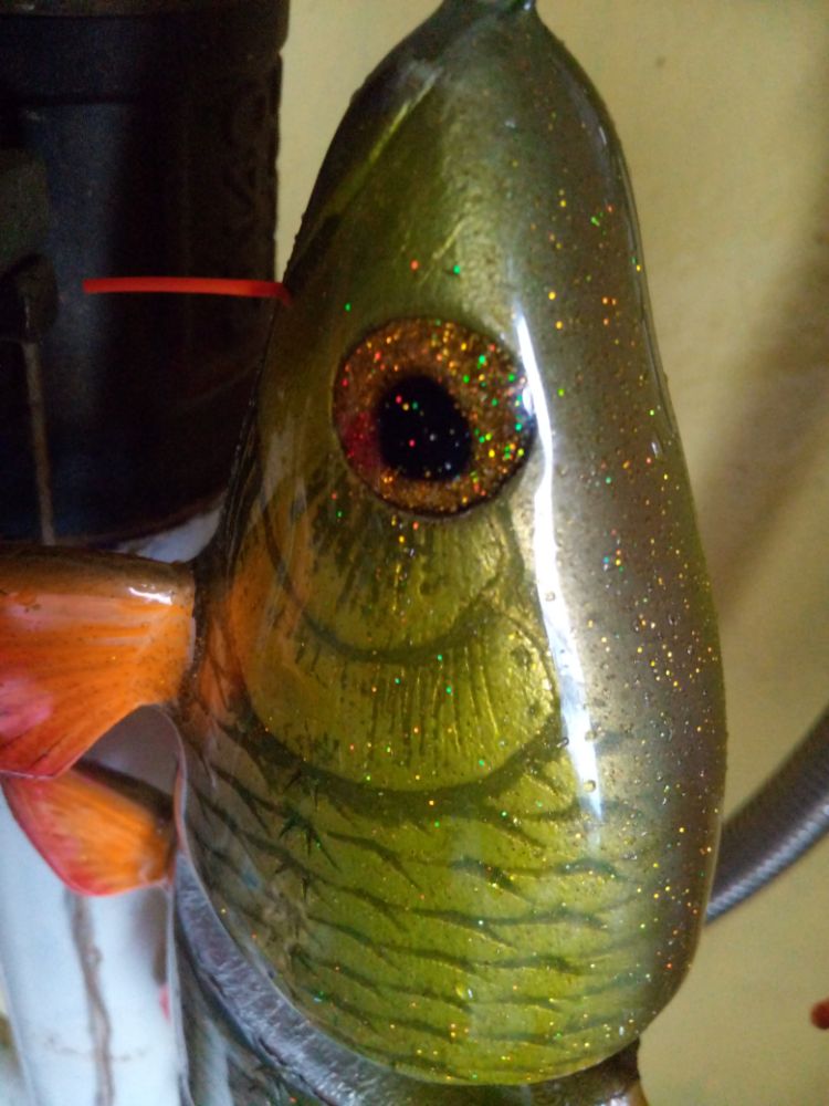 Для рисования зрачка сделал трафарет: пластик из под китайский глазок, лайнером обвел по контуру, выжег гвоздем и придал форму круглым надфилем. Малярный скотч снимал в охлажденном состоянии, чтобы липкий слой не остался на приманке. Лакировка энвиротексом всей секции сразу. Сборка на скрутки, усы из обрывков штекерной резины 1мм.