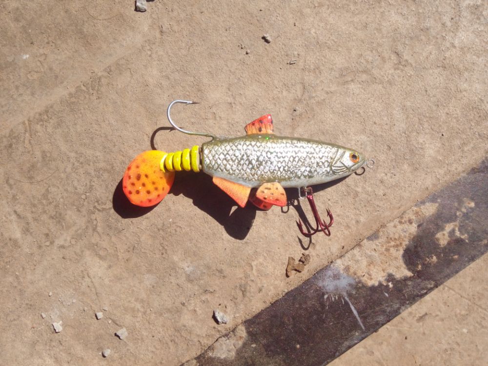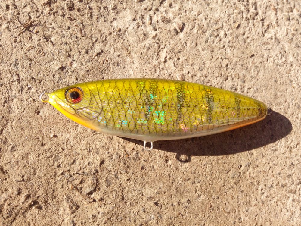 Огрузка расположена в задней части. Вся передняя часть полая с шариками разного размера и веса. Игра очень интересная. Расположение в воде под углом около 70 градусов к горизонту, из воды торчит только часть головы с плоской площадкой. При рывках уходит в пленку воды или чуть глубже, но не больше 5 см от поверхности, при этом совершает уходы в стороны. При резких рывках с переворотами. При остановке два заметных качания. Первое, когда возвращается в исходное положение, второе, когда шарики скатываются в заднюю часть канала. Одна из атак была как раз в период второго покачивания на паузе. При рывках уходит под воду с мягки хлюпаньем. Гораздо более тихим, чем у поппера. Также поднимает небольшой фонтан брызг, тоже меньше попперного. Из-за располжения огрузки и шариков дальность полета необычайная. С меньшей проверить всю дальность не мог, т.к. не хватало длины прямых участков реки. Ниша этой приманки заросшие мелководья, необоходимая глубина - длина приманки на паузе с тройником.