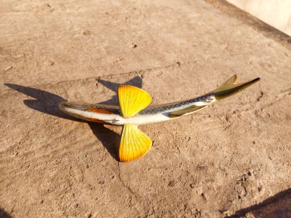 добрый день. 18см, тонущий в среднем темпе. Героического ничего, но пробовал новую технику: ткань покрыл лаком до 1мм, вырезал чешую по лаку. Была мысль выделить чешую аэрографом. Но по лаку без матирования разметку нанести не получается - тут же стирается, после матирования работать с аэрографом не стал - оставляет темный фон на матированной поверхности. Кроме того резец постоянно соскальзывает по лаку - травмоопастно, при вырезании трижды порезал пальцы. Повторять желания нет, никому не рекомендую. Чушую выделил лимонным маркером и черным лайнером.