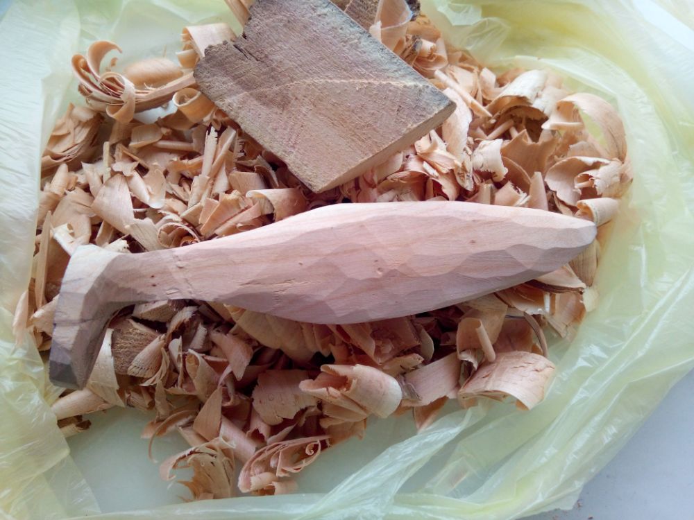 Вид сверху нарисовал произвольно, приблизительно 2 части ширины к 3 частям высоты. Вырезал ножом. Ножовчным полотном разделил на сегменты.Из обрезков и оставшегося сегмента с трещиной выпиливаются заготовки для плавников. До необходимой толщины довожу рашпилем и крупным напильником. Лобзик, ласточкин хвост.