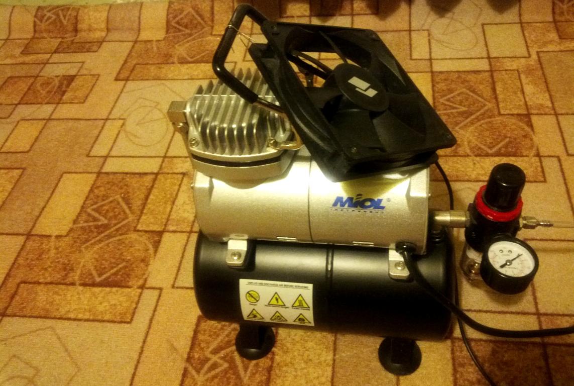 А проблему с нагревом в такую жару решил так. Вентилятор компьютерный 12 см на 12 вольт запитал от БП от ноутбука. Сделал так, чтобы обдувался весь корпус, а-то корпус компрессора тоже прилично греется