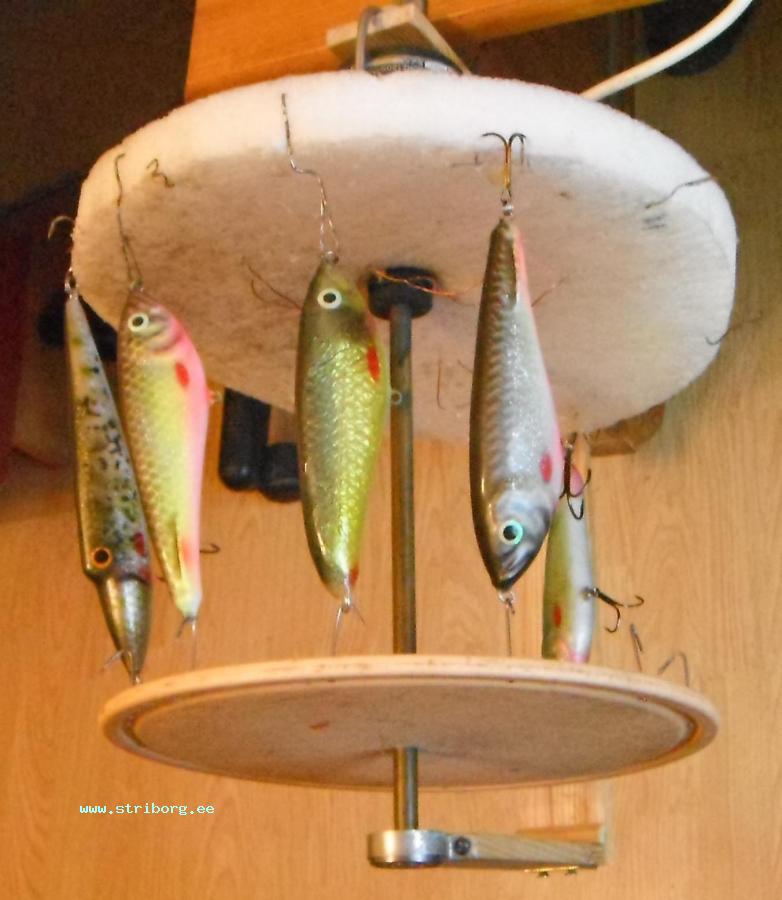 По просьбе друга, показываю свою конструкцию сушильного колеса. Ее особенность в том, что один из дисков сделан из упаковочного пенополиэтилена. И при покраске и при лакировке, приманку держат за скрепку, которую потом удобно втыкать в тело диска. За счет своей упругости, диск растягивает каждый джерк и этим надежно их фиксирует. Основание этого диска укрепленно стальной шайбой, приклеенной горячим клеем. Растояние между дисками изменяется, т.к. твердый диск может перемещаться по валу (трубке) и фиксироваться отрезком резиновой трубки. С одной стороны вала находится двигатель РД-09 (редукция 1/ 137), а с другой шарикоподшипник и обьединяет их П- образная дерев.рама. Вся конструкция крепится на фотострубцине.