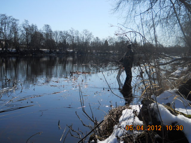 Всем доброго времени суток.Ну и я вчерась открывал сезон жидкой воды,можно так сказать.Подъехал тож,где-то около восьми,машину удалось приткнуть только почти у самого асфальта.Но раньше,не видел резона т.к.термометр казал минус.С собой удочка(разговоры,ловят на удочку,и рядом с берегом),ну а основную ставку всё одно решаю сделать на фидер(фидераст из меня ещё тот..).Хотелось поиметь парочку карасиков,таких,красивеньких.Уж больно их интересно выуживать,да и на сковородочке,вкусны бесспорно.На что реально рассчитывал,да не на что,в том году два раза выбирался,и была такая же погода,и оба раза пролетал.Но лучше съездить и успокоиться,чем сидеть дома и думать:а вдруг?.Подхожу я значит к мостку и наблюдаю такую картину:весь правый берег,за исключением нескольких человек свободен,за то напротив,плечём к плечу,в основном поплавочники.Проходя чутка тормознулся поглядеть,да полавливают маленького карасика вперемежку с уклейкой.Нет не на такую рыбалку хотелось,и протопал дальше,чуть выше,свозь любимые дебри,на глубину,и расположился в гордом одиночестве.Первые пару часов пробую ближнию,среднюю,далбнюю дистанции,всё как в лужу.А с неба вроде как и дождь,но какой-то не мокрый,то белый,то серый,пощупал одёжу,нет не мокнет;тока вот левая нога,в зимнем сапоге вроде как похлюпывает,думал осенью показалось,ан нет.Но для заброса приходится снова и снова входить в воду,согревает надежда,что вот сейчас,вот случится,произойдёт.И произошло.Поклёвка не поклёвка,но как то странно,и одного опарика не хватать на крюке.Туда ж,непонятные колебания палки,подсечка;опять не дсчитываюсь наживки,и следующий вроде как за попу укушен.Пуляю опять туда ж,уже веселее,как буд-то,аха,есть,или нету,и всё ж есть
