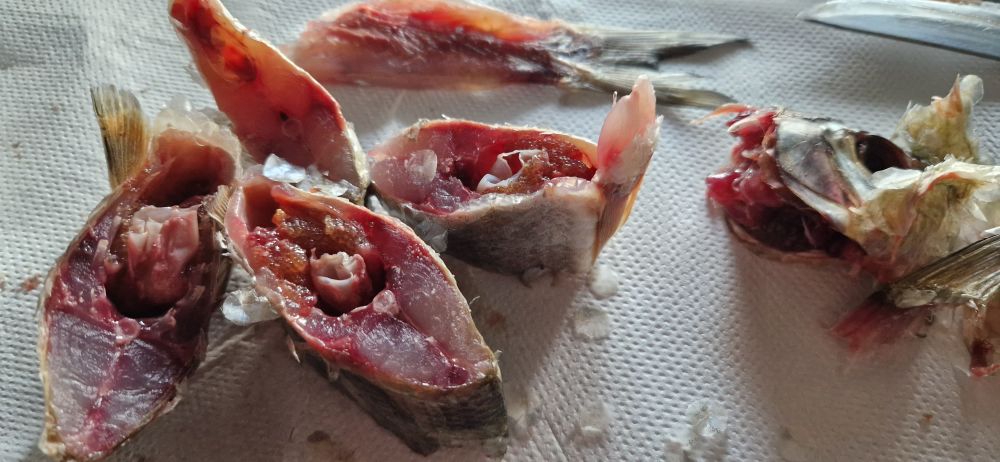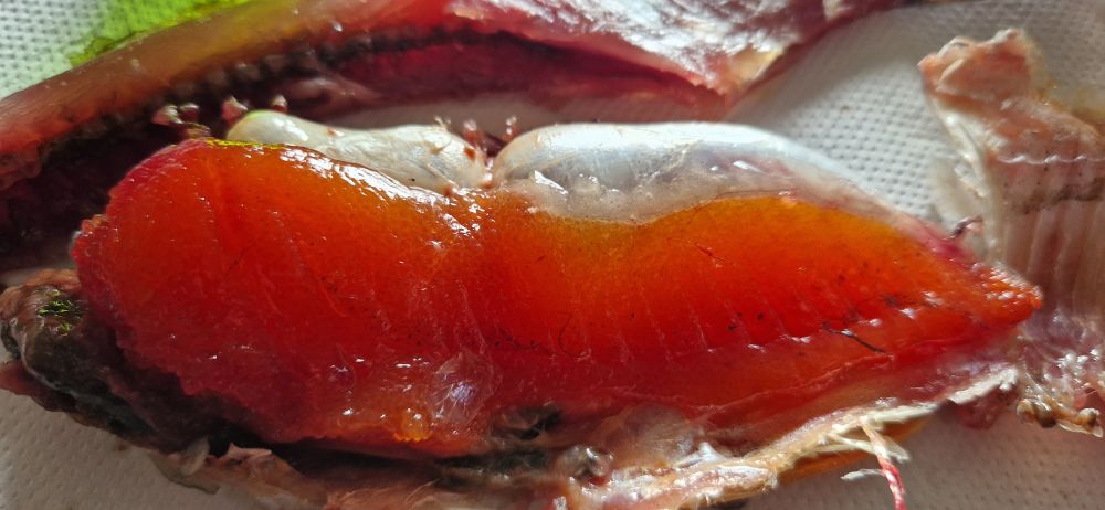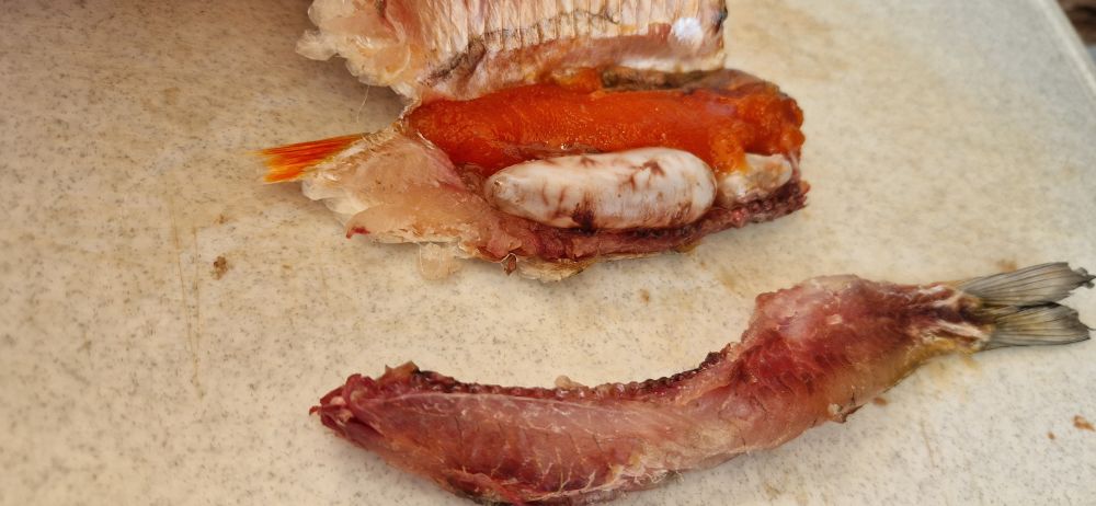 но вот фотку девочки выложу. Икра ярко оранжевая очень мягкая и вкусная, напоминает икру солёной селёдки, но более вкуснее, мясо на рёбрышках селёдкообразной мягкости (имею в виду солёную), спинка слегка подвяленая по плотности, вкусно одно слово. Буду пробовать вимбу с потрохами сушить с принудительным обдувом. Как солил раньше плесневела, только открытая с распорками просыхала, в этом варианте соления есть надежда, что соль глубже проникла в кости.