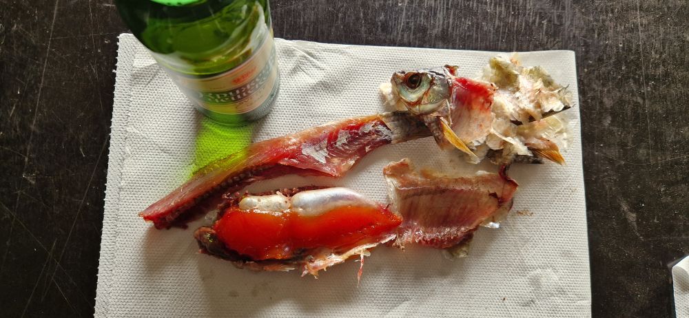 А вот мясо нежное, захотелось вареной картошечки... Сожрал и про пиво забыл, пошёл за второй. Вот эта, мне по вкусу вимбочка соленая пошла, ещё не балык, красиво не почистишь, но вкусно и сытно, к варёной картошечке зачет.