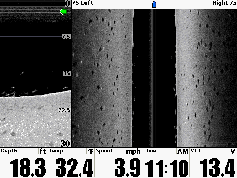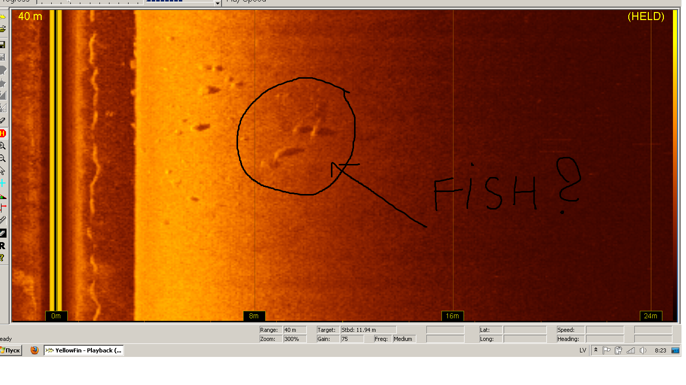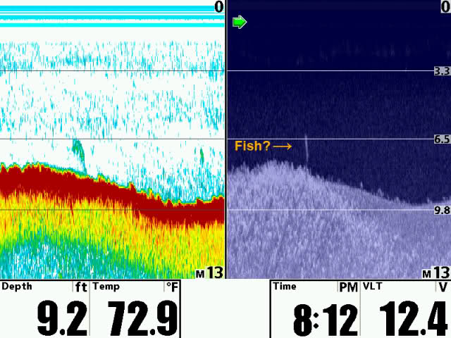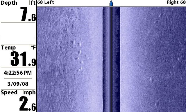 Нашёл ещё пару скриншотов ихних судаков (Walleys) я так понял 1-2 кг: на глубине 2,5м и 4,5м. Похоже это предел для SI по такой рыбе, да ещё на ровном песке: