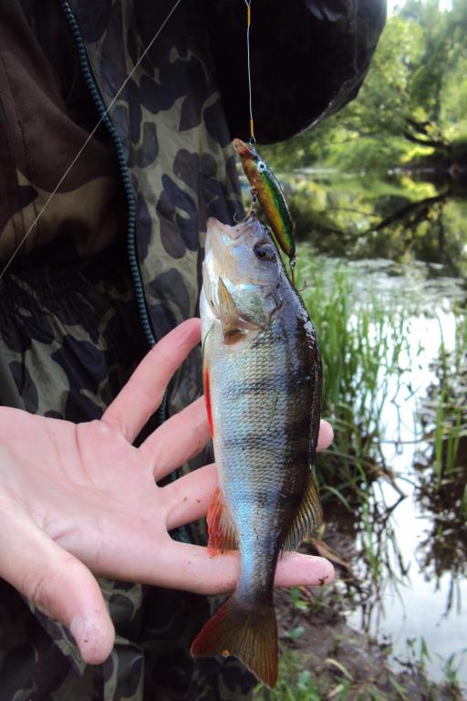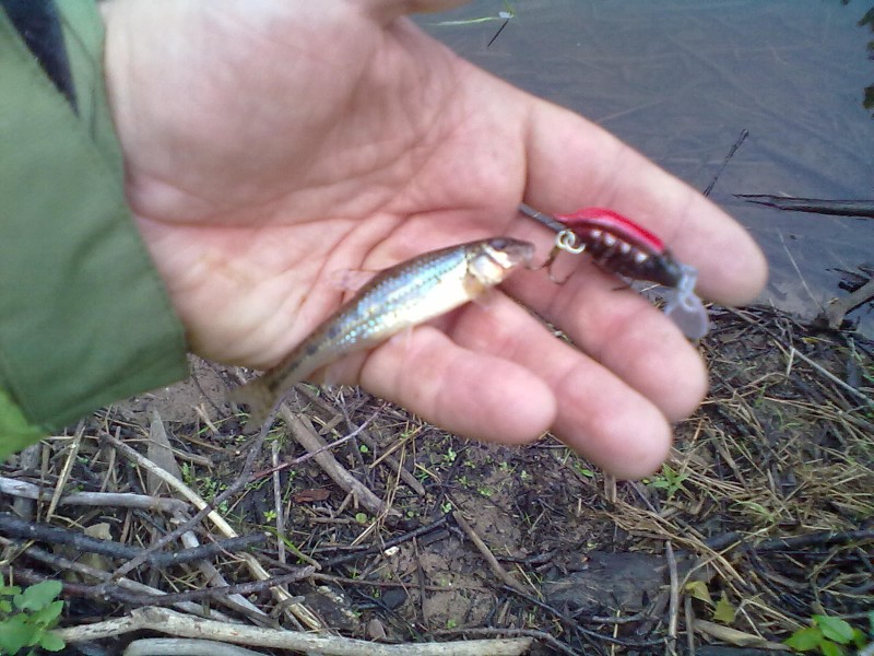 - жерешок грамм 100.В какой точно момент взял не знаю,может после того как воблер всплыл(все плавающие)или во время всплытия,но то что на паузе это однозначно.Первый в жизни жерех.К тому же на самодельный воблер.К тому же первая рыба на самоделку.О как всё круто!Далее вешал и не только самоделки,но их хотелось тестить,да и играют порой так,что и доставать не хочестя - твичил бы и твичил.Вешаю другой(зелёный,около 55 мм).Заброс,Ещё даже особо подёргать не успел - тяжесть.Подтягиваю - что-то посолиднее.Окунь грамм 150.Вот такие дела.Вчера ещё одну миноху обкатывал - ничего.Есть такие воблерки(которые покороче)идут у самой поверхности,вроде когда дургаешь они твичатся,но совсем не так как те,что по 55 мм.Короче всё это очень интересно,кидал в самые корчи,один раз даже на дерево закинул,попрощался с ним - но мне повезло и воблер удалось спасти.Фото добавлю немного позже