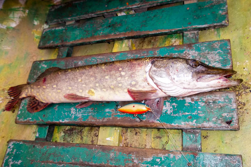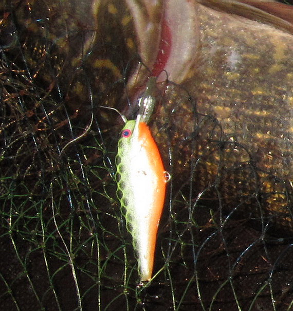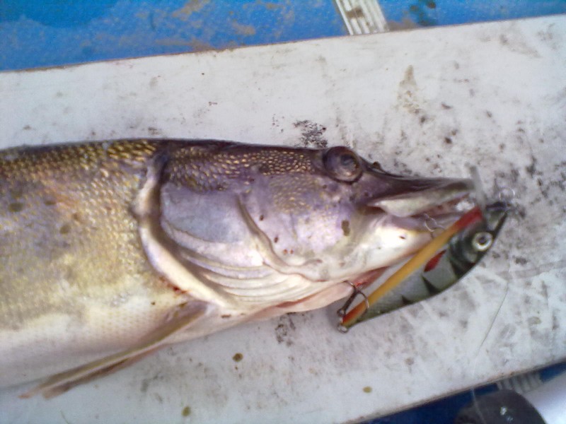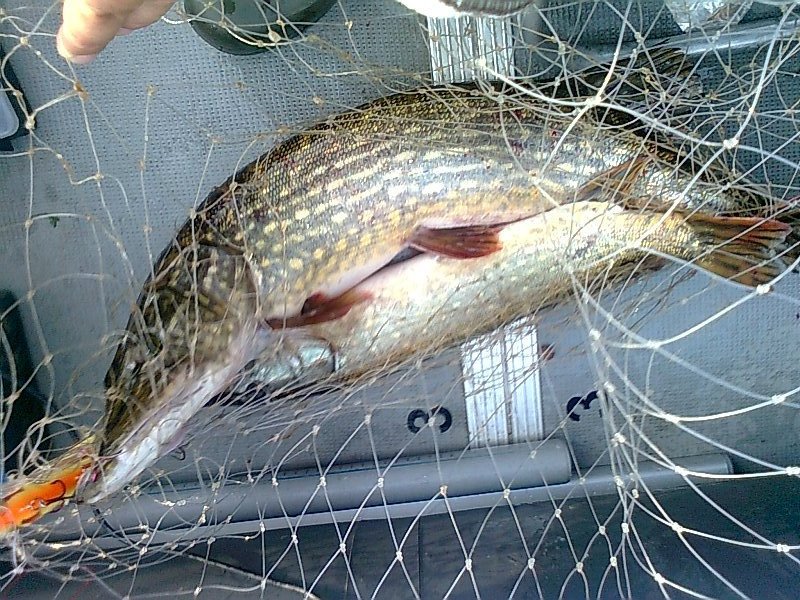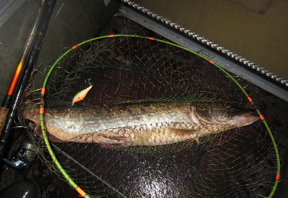 На воду выполз только в р-не 22-00. На вечерней зорьке удалось реализовать три поклёвки на шеды-7 см. с короткими лопатами. В связи с тем, что щучки были меньше килухи отпустил их с богом набирать весу. В р-не часа ночи хотел было уйти на берег по приглашению товарищей, но по пути вдруг загнула одна не плохая. При подводе к лодке щучка висела на одном тройнике воблера и при попытке подсачить её второй тройник зацепился за сачёк, когда как сама рыба была снаружи подсака (классика!