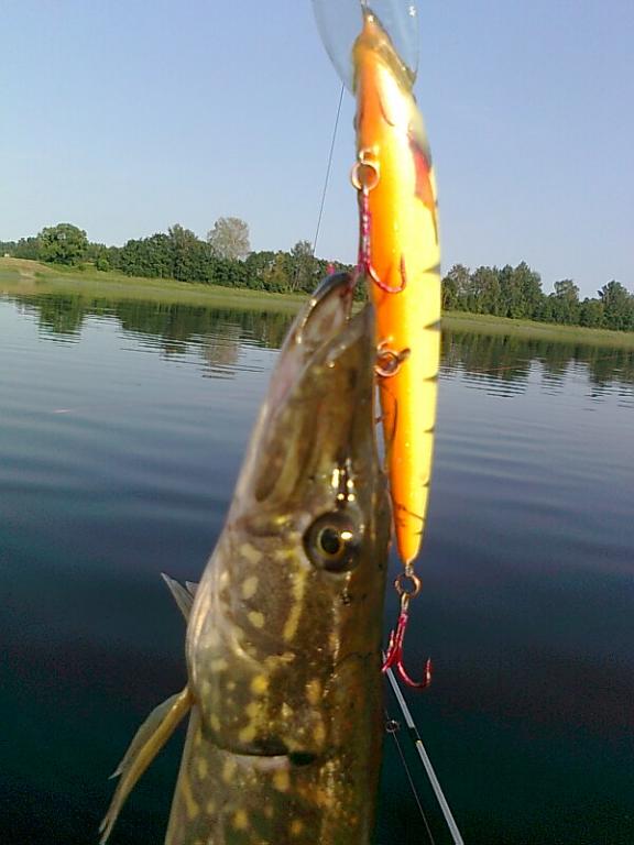 Глубина 2-3-4-5-6-7 метров, нашел старое русло и пошел троллить вдоль него. Метров через 200 удар и спиннинг с новым воблером, чуть не выпрыгнул и подставки, еле успел его схватить, визг фрикциона, минут 5 пытаюсь поднять рыбу к поверхности, не получается. Потом потихоньку стала подниматься и вот уже щука у лодки. Увидел и обалдел - окрас почти черный, вся спина поцарана и на вид весом кг на 7 - БРЕВНО!. Подсак при ловле не использую и это единственный раз когда сильно пожалел об этом. Три раза подводил щуку к лодке, но она пыталась уйти в глубину. Воблер полностью в пасти у щуки, только голова с лопатой торчит, я успокоился и был уверен, что ей теперь деваться не куда, но на четвертом подходе увидев мою протянутую руку, щука развернулась на 180 градусов и пошла как паравоз назад, поводок встал на излом и щелк! разогнулся фиксатор застежки. В итоге ни воблера - ни щуки! Одни маты....