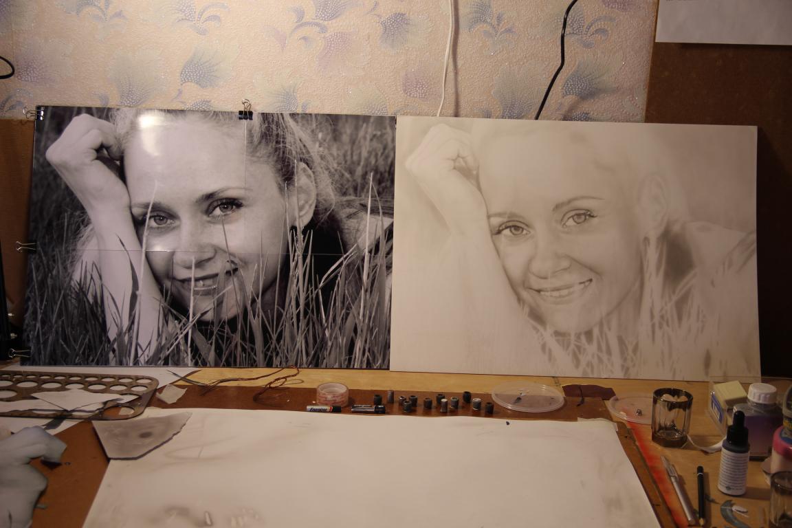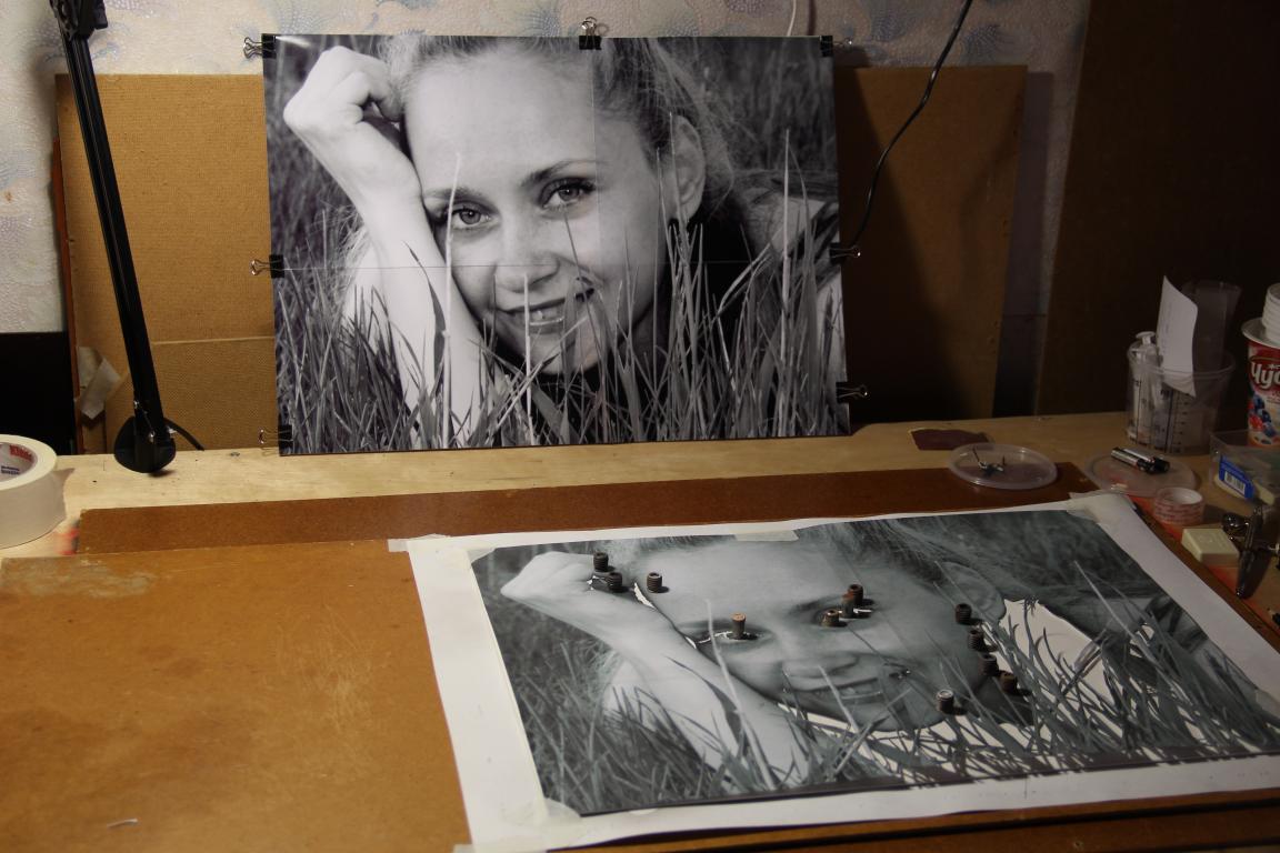 По портретам. Эпидиаскоп удобная штука экономит кучу времени, спасает в работе на больших площадях, но хороший мощный стоит как крыло от боинга потому у меня его нет ((((( Опорный трафарет для разметки контуров дальше с помощью лекал.