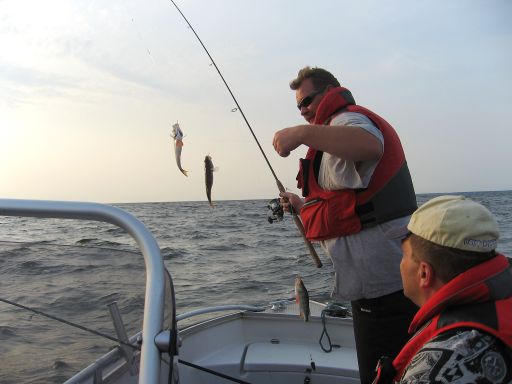 Запомнился забавный нюанс...Стоим на якоре, ловим, невдалеке летит посудина с 3 или 4мя челами на борту...МОтор, понятно,ю работает громко, поэтому они орут друг с другом, а не разговаривают..Вокруг тоже все слышно: