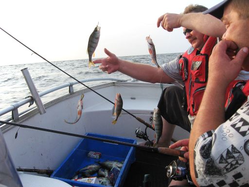 Знакомый с работы был в прошлые выхи в Кальма, в субботу к обеду с сыном взяли 23кг, на чём и успокоившись удалились. В воскресенье тоже хорошо поймали и еле успели от шторма свалить в берег. Окунь довольно крупный, также цепляются судачьи мальки и крупная плотва на мелкий риппер. Сдурела рыба от жары