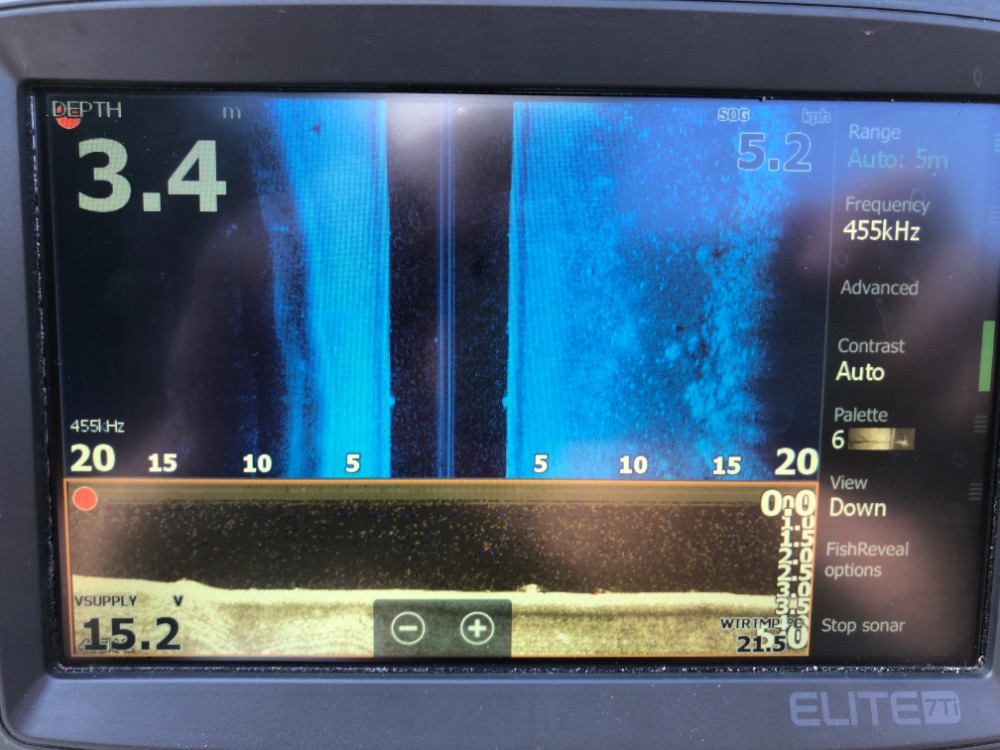 Увеличив фото, на Айпаде будет видно что иду по центру реки и с левой стороны пологое дно и нет никаких бровок или мелей, но на эхолоте видно что с 5 до 10 метров идут помехи от отражения а дальше всё в тени. Одним словом должно быть как в правом луче - найди 10 отличий