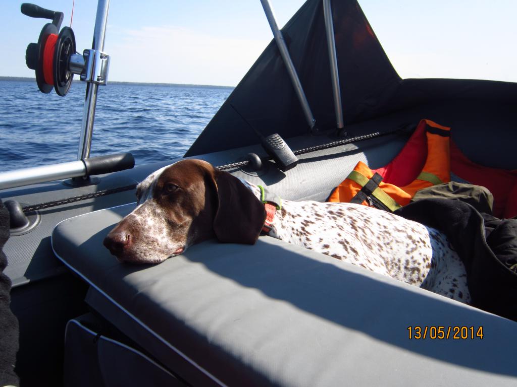 не, не страдает. Она уже привыкла с нами ездить по рыбалкам и охотам. С большим удовольствием ловит рыбу) и ест ее)