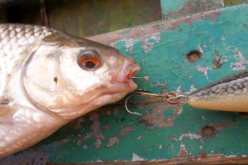 Помимо нескольких мелочёвок, которых утопил обратно - поймал пару съедобных, которые еле держались на тройниках и будучи в сачке открутились сами. Так что сегодня можно было смело ловить без поводков.