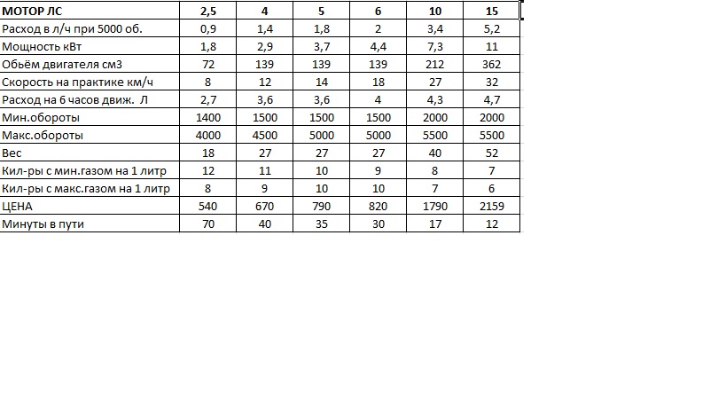 Составил табличку тех.данных (данные взяты для моторов 2,5 и 15 лс из практики, остальные из книжки тестов моторов Ямаха за 2010 год) Сразу оговорюсь, предвидя замечания людей знающих, моя табличка составлена из опытов на практике- рассмотрена типовая рыбалка в 6-7 часов с длиной пути до места рыбалки от 4-6 км. Вид рыбалки-троллинг. Основной аспект при анализе-выбор "золотой середины" между ЭКОНОМИЧНОСТЬЮ расхода топлива и временем в пути до места рыбалки, если учесть, что рыбачить хочется часто