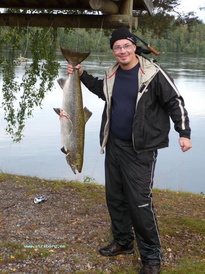 На следующий день погода была лососевая: сильный ветер и дождь и вся наша команда обрыбилась. Пять рыбин весом от 7 до 12 кг взяли с собой, несколько отпустили с миром. Были и поклевки, закончившиеся обрывами лески. После поклевки приходится очень потрудиться, чтобы довести рыбку до берега. Адреналин хлещет через край.... Мощь рыбы, да на течении просто поражает.