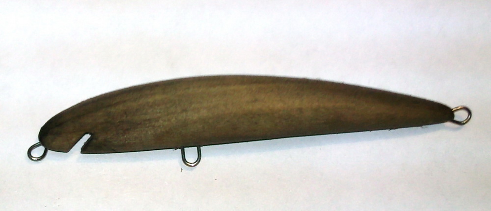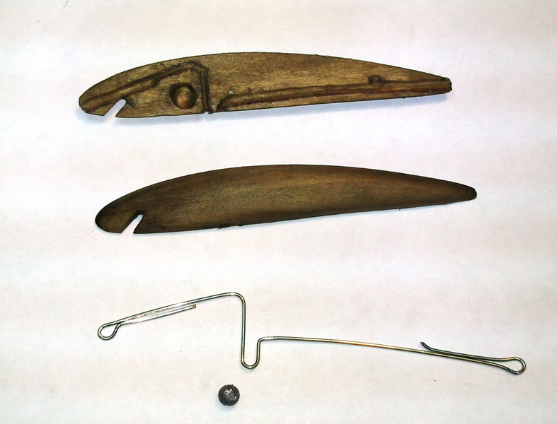 22. Очищаем петли и паз под лопасть от лака, собираем воблера: ставим крючки и временно фиксируем лопасть. Лопастей желательно иметь несколько, разных форм.