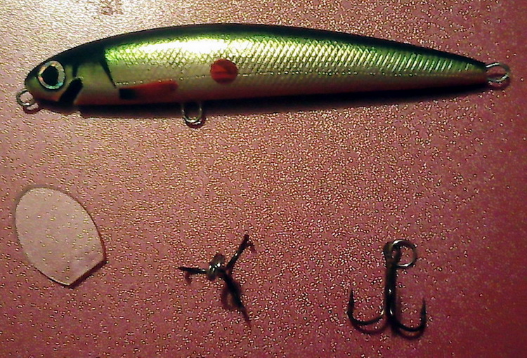 26. Просушиваем воблер, удаляем лак с петелек. Желательно воблер после не мочить ещё неделю, пока лак окончательно не станет прочным. Собираем воблер: одеваем крючки с петельками.