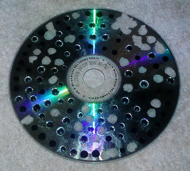 Эти глазки я делал так: на CD-R без изображений или на вскрытом DVD (т.к. блестящий слой находится внутри), наносил капли черной краски (можно торцом сверла) и капли прозрачного геля для наращивания ногтей (цена от 100руб. за баночку) и на 1-2 мин. под ультрафиолетовый светильник (цена от 700руб.) и глаз готов. Наделал их сразу на диске побольше. Можно вместо точки чёрной краски использовать кружок из черной плёнки высеченный просечкой. Лампу можно приобрести и без светильника – отдельно, а потом светильник собрать самому. Но можно вместо геля использовать эпоксидный клей. Но тогда увеличивается время застывания и невозможно контролировать будущую форму глаза.