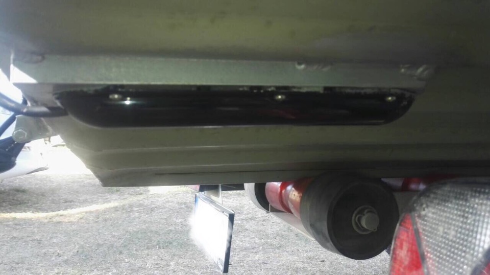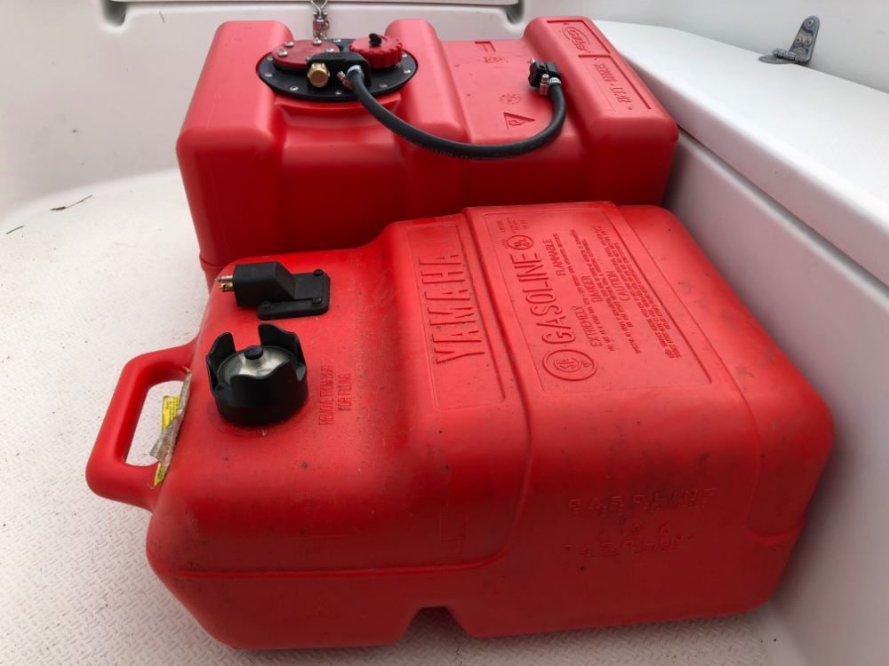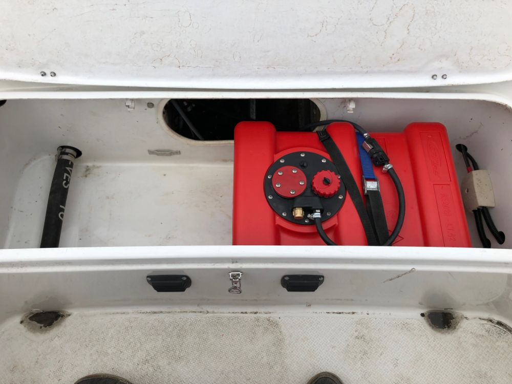 Что бы бак не скользил, я наклеил по углам двухсторонний тейп и дополнительно застропил его в рундуке. Фитинги на крышке заменил на металлические и поставил родной коннектор для возможности переключения на второй (родной) бак если понадобится его брать с собой. Всё получилось как и хотел - теперь не надо каждый раз ехать на заправку и доливать бенз перед каждой поездкой