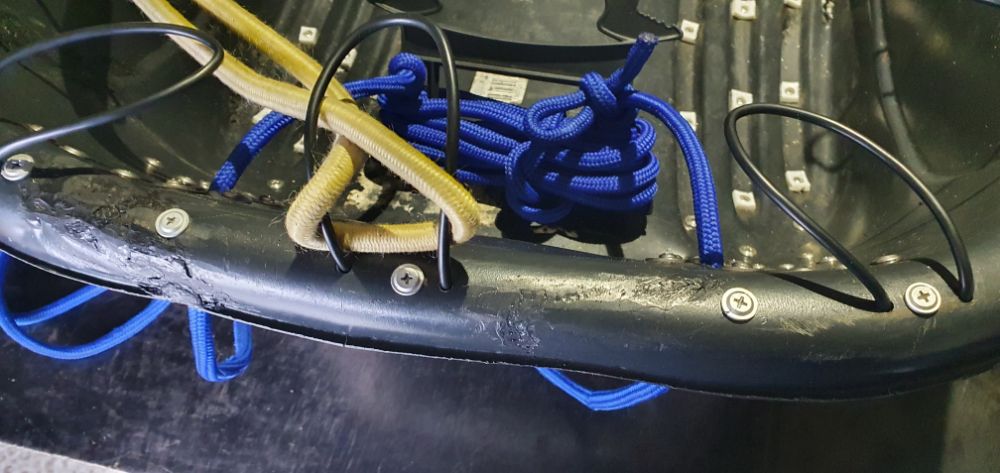 В передней части поставил из винила пластину для усиления отверстий верёвки. Верёвка 10 метров, диаметров 8мм, синтетика, 6м ушло на петлю и 4м в запасе, всяко бывает зимой на льду, всё замечательно наматывается на мотовило и хранится прямо в саночках. Да, ещё надо будет сверху установить тонкую верёвку для крепления резиновых стяжек, хотя вроде ни чего зимой не теряли, но как говорится бережёного бог бережёт, не помешает.