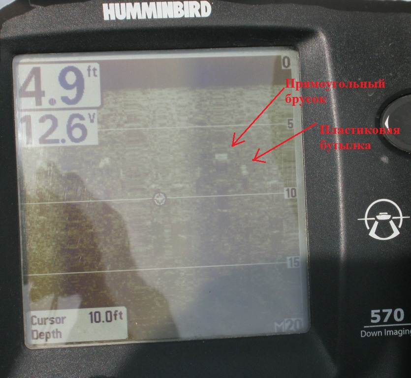 Заякорился на лодке на глубине 2,5 м, опустил датчик до глубины 0,8м от дна и вращая отчетливо увидел прямоугольный брусок 35см на 12 см в 15 см от дна и слегка наклоненную пустую пластиковую 2л бутылку. Всё это видел с тенями до 5 м и это не предел. Зимой буду изучать наши заливы