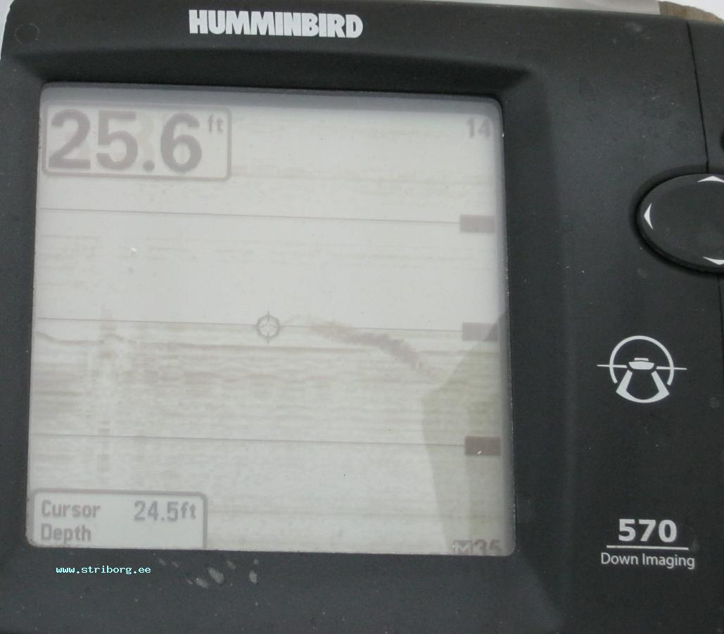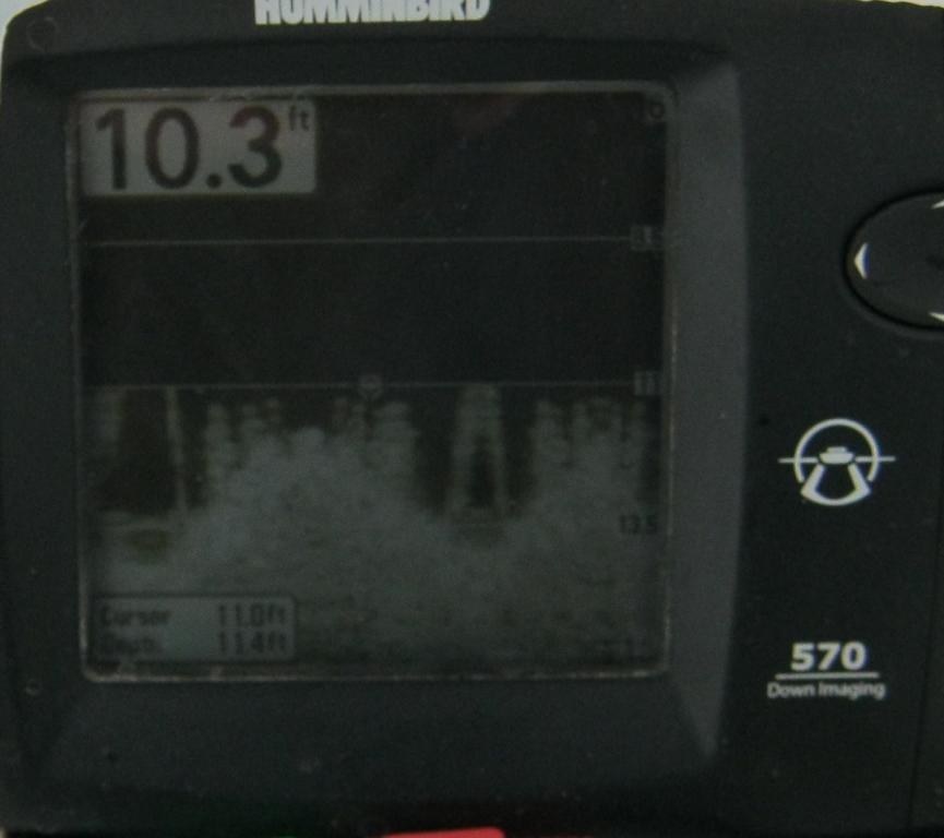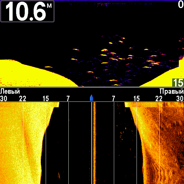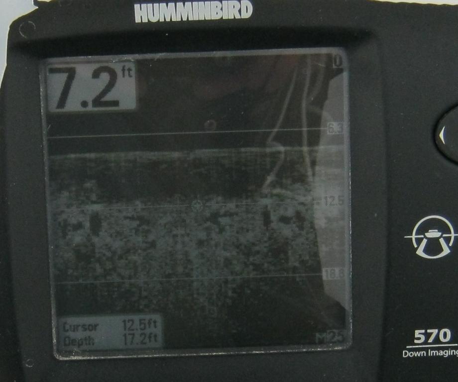 Весьма доволен использованием плоского сканирующего луча для наблюдения рыбы с берега. На первом снимке видно как рыба обступила придонный поплавок и крючки с наживкой в 15м от берега. На втором нырок (утка) пронырнул над этим же поплавком (40см от дна):