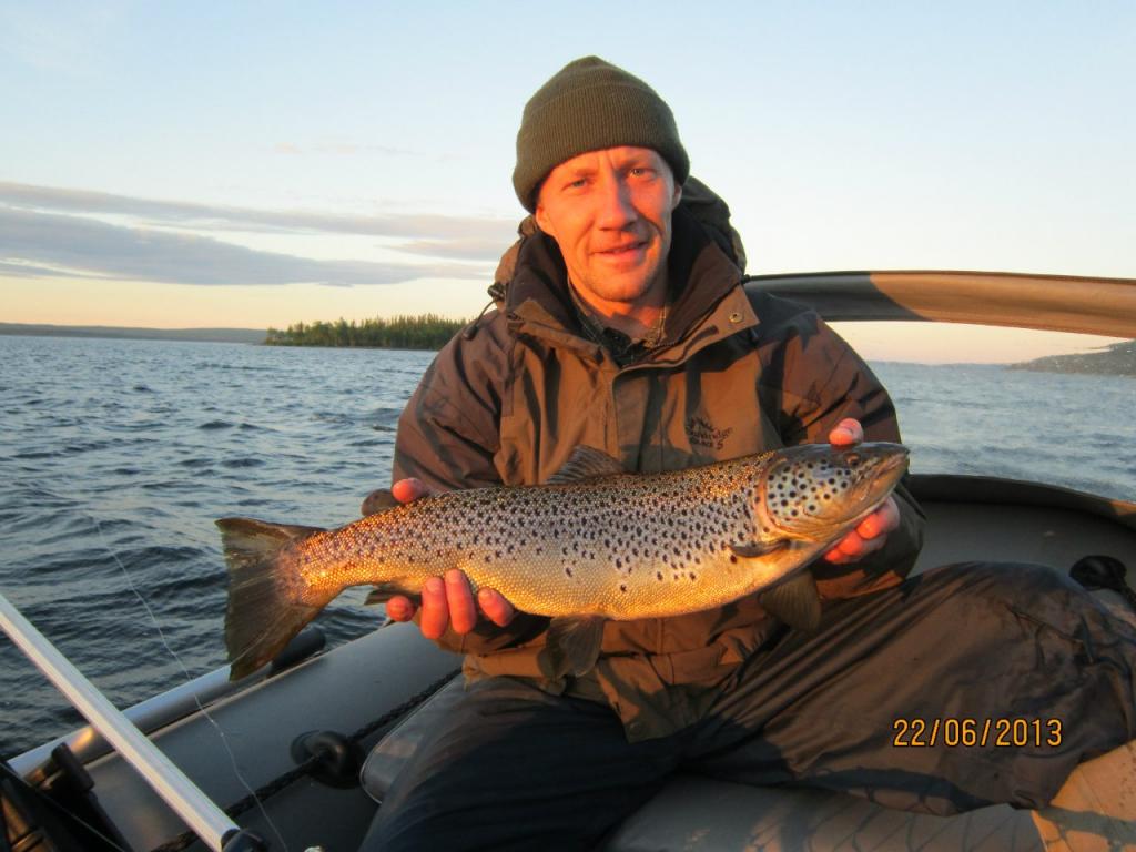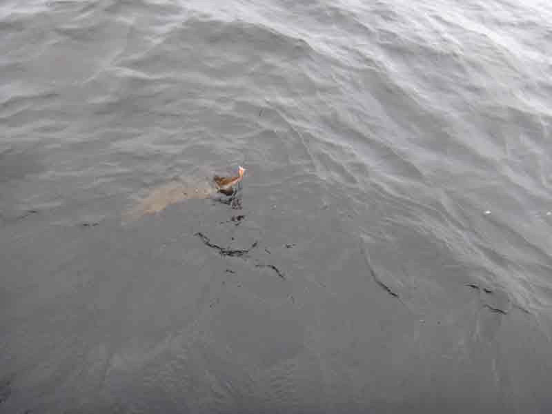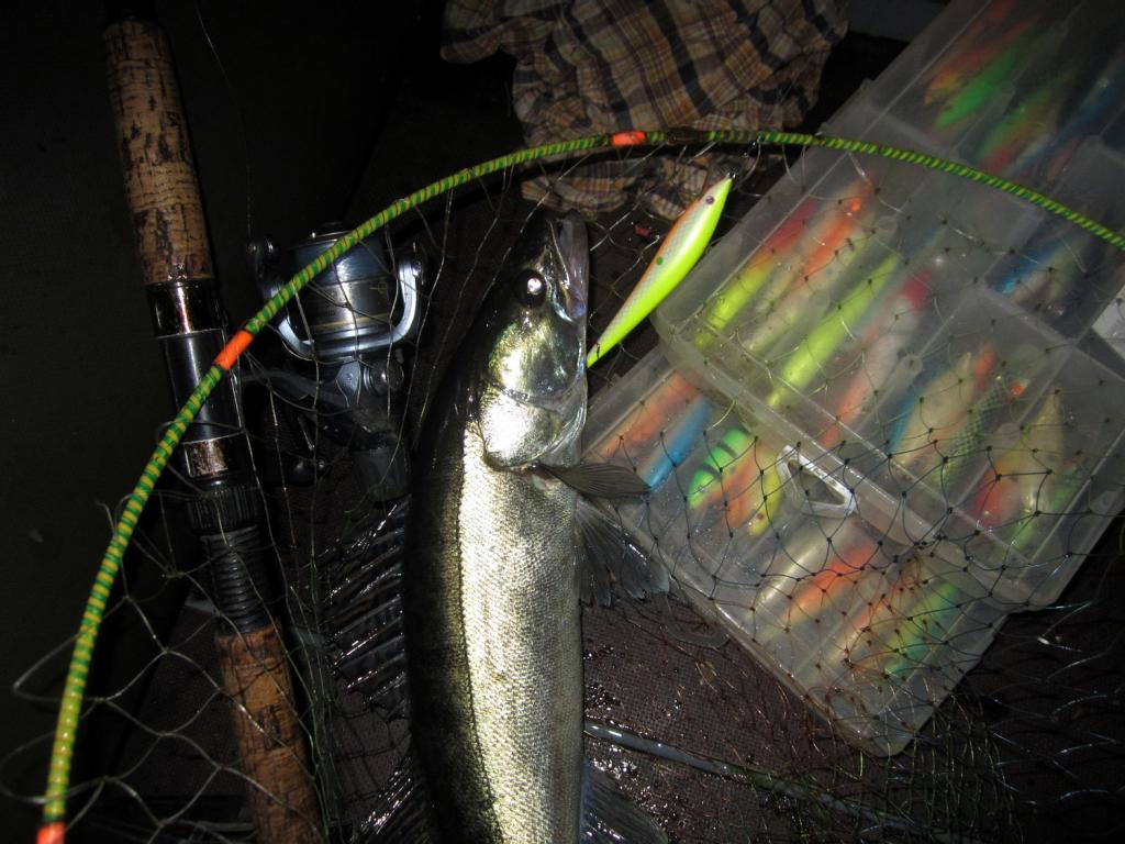Клюёт на верховые модели с заглублением 1-2 метра и в основном на коротком отпуске от лодки (до 30 метров). Ночью отпуск вообще колеблется от 10 до 15 метров и цвет приманки меняется на жёлтый флюр. Похоже, что грохота мотора он вообще не боится! Поклёвки очень резкие, не раз вылавливал в воздухе уползающий за борт спининг с перетянутым на катухе фрикционом! Даже не очень крупная рыба сопротивляется очень достойно, приходится переключать двигло на нейтралку. На акватории можно наткнуться на разные стайки. В основном это мелочь в р-не 300-400 гр., которая вешается просто дуплетами.