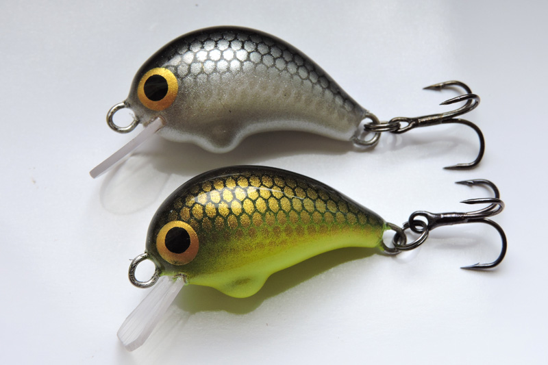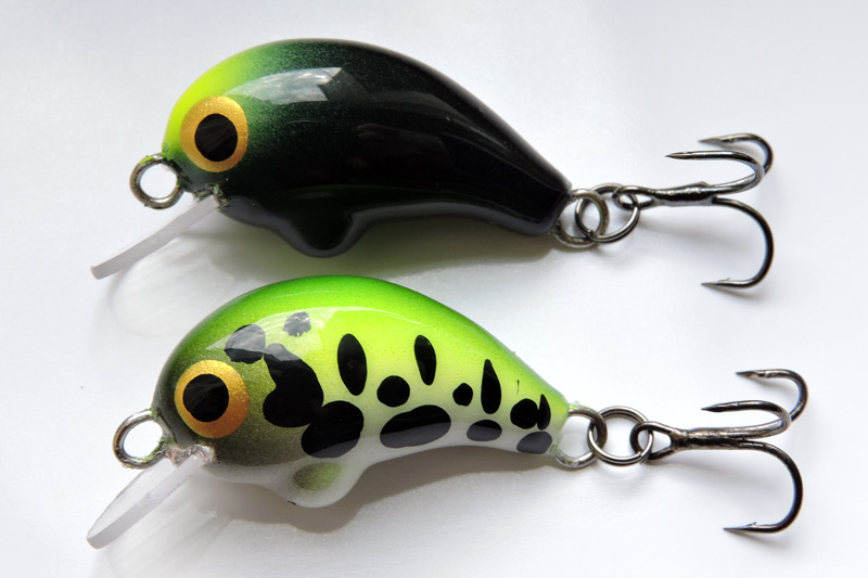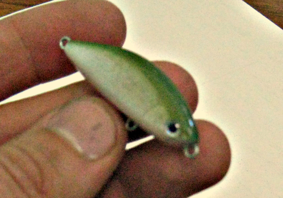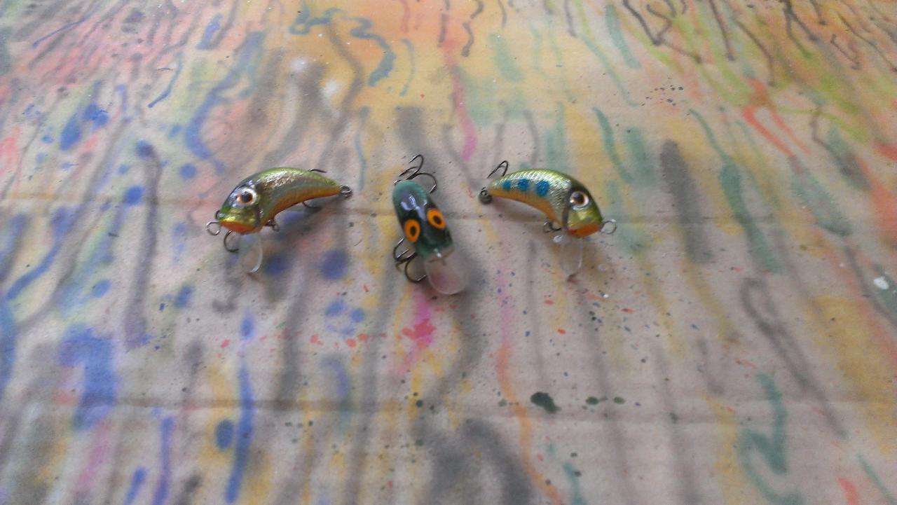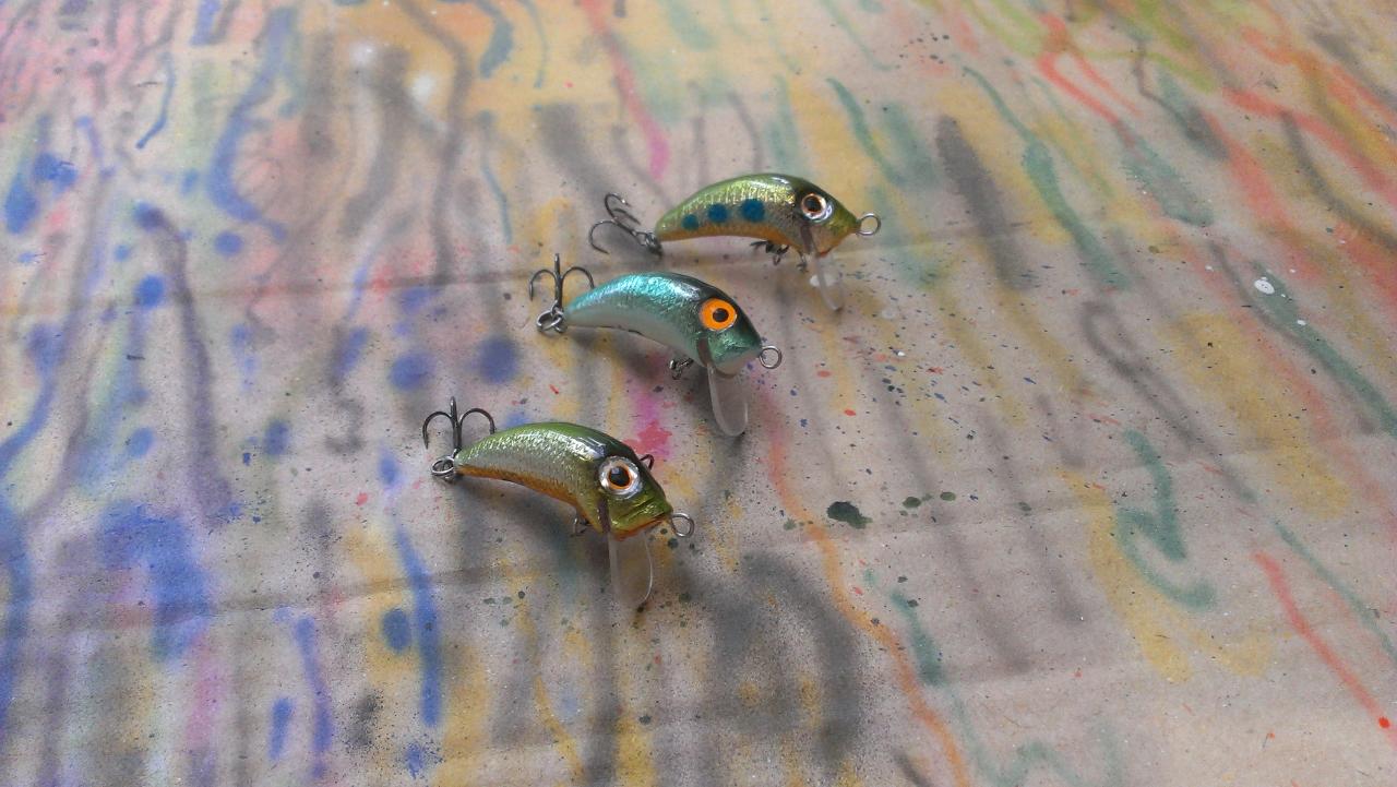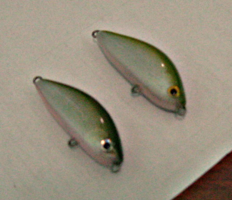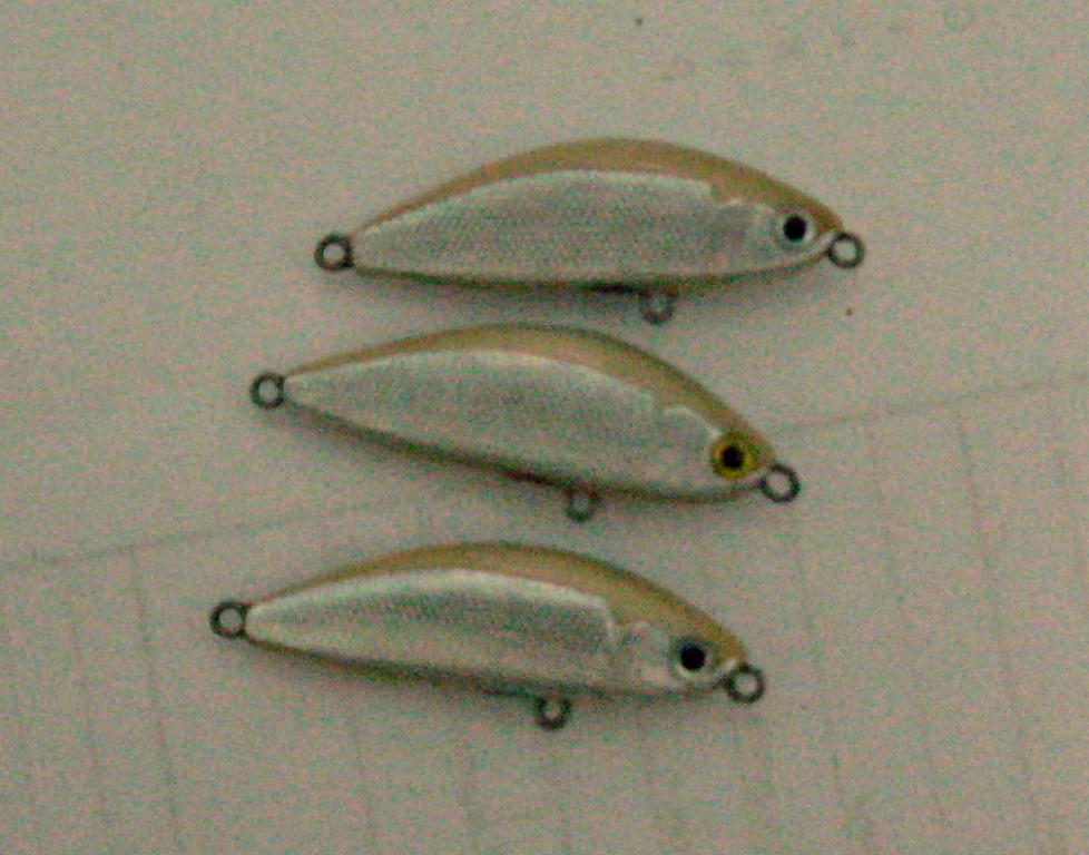 Бальса , 38 мм , тонущие , тихие . Оранжево-глазый уже успел десяток голавлей соблазнить . Вес без крючков : зелёная спинка с синими точками -3,3 г , оранжево-глазый - 3,5 г , зелёная спинка без точек - 2,9 г.