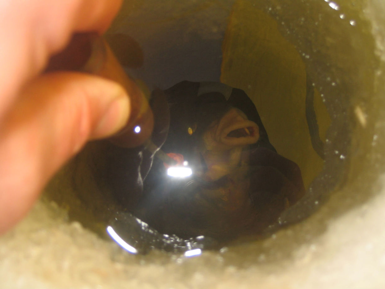 ЗЫ: Хотя если уж его голова на улице, видимо просто по верху лунка подмёрзла и было достаточно самый верх расширить.