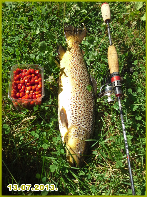 Решил в субботу съездить за земляникой для своих ребятушек, лесные витамины для детей очень хорошо. Лес находился рядом с форелевой рекой и после сбора ягод решил протестить новый ультралайтовый воблерочек.