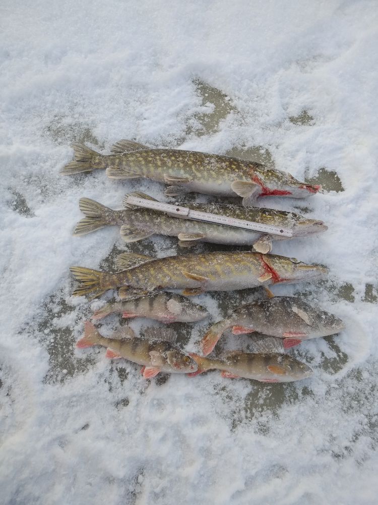 Ну вот,продолжительные морозики сковали речку,второй раз,если считать возможность выхода на лёд.Три дня уже осваиваю ближайшие окрестности,страшно,но хочется попробовать где поглубже,а на течении ещё журчит водичка и мороз ей нипочём.Первый день одарил щучкой около килошной,первой в этом году,на балансир.Вчерашний только недомерок на 200грамм.Ну а сегодня добрались до ям,именно добрались,снегу в лесу в достатке.С аккуратностью с (пешней) вышли на лёд,от 8-12см и это после двух недель минусовой температуры..,какие же раньше были морозы если лёд до 30см намерзал.Ну да что есть,засветился и на первой же лунке после тридцати махов села размерная щучка,хорошо,уже результат!Лунок через пять ещё одна такая же,уже замечательно,хорошо бы и окунь проявился и он появился! Поклёвки были до часу дня и дальше тишина,добавилась ещё одна щучка за килошка и три опушка.Лучшая рыбалка этого года и прошлого тоже.Ямок ещё много,разведывать и разведывать,пока лёд есть.Ну и всем успехов на ваших водоёмах.