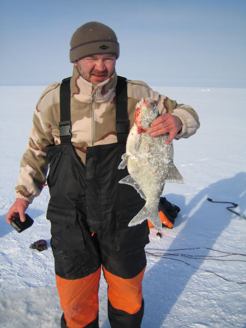 Рванули на прошлогоднее место – и снова никаких торосов огромный плес. Но первые же лунки показали присутствие рыбки – окунь, плотва. Опускаю блесёнку – удар и некрупный окунек на льду, опускаю мормышку и на льду красавец грамм на 300 или упитанная плотва, так и чередовал пока не почувствовал на леске ( на удочке с мормышкой) приличное сопротивление…КРЮЮЮЮЮК !!!!!... и товарищи спешат на помощь с крюками. Раздеваюсь – ложусь на лед достаю рукой до головы леща – но в лунку никак. Зацепили двумя крюками – рассверлили лунку - снова разделся, развернул его подо льдом – и на льду красавец ЛЕЩ на 2,300. Ну времени это все заняло минут 20-30. И спасибо товарищам за помощь !