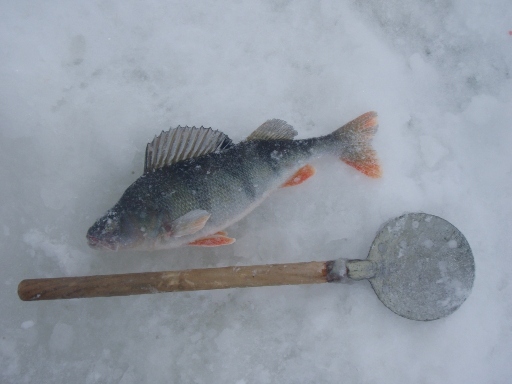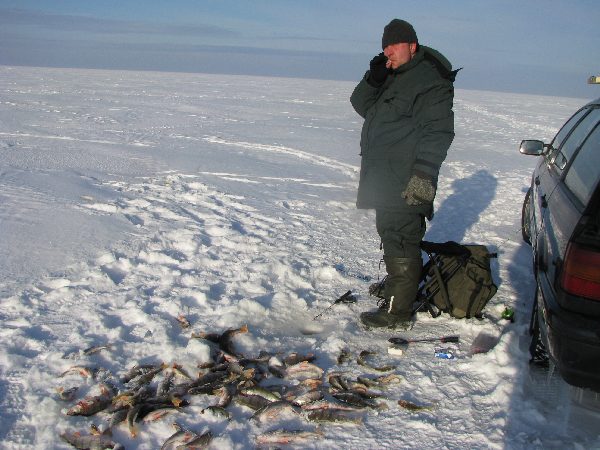 Ох и неуютно на улице...может, обратно в палатку?Ладно, погуляю пару часов...Отошел недалеко, метров 300 и уже с 3ей лунки начинает отзываться добрый окунь. Больше лунок мне не понадобилось. Ловил на пустую мормышку (без насадки)...В такой ветер сложно было придать мормышке нужные колебания, пришлось укоротить кивок, благо окунь ел так, что порой удары передавлись в руку.В общем, ловился окушок справно. Посидел часа 3 , решил, что довольно, 15кг доброго окуня,пошел в палатку, в комфорт.Ребятки в палатке раздухарились на столько, что на внутренней ее стороне образовался конденсат, а когда я открыл полог, внутри был воздух такой, что в пору топор вешать. Ребятки насверлили лунок, накормили их и малость потягивали окушков, ершей и плотвичек. Больше отдыхали, поэтому уловы не были большими.
