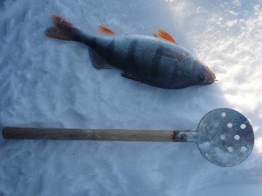 Лед мощный, но пробивается у всех с разу, и вот у же кто то ловит первого окушка. Достаю секуху, упираюсь в нее, замечаю пару невнятных толчков. Отбираю ерша у Игорехи, цепляю глаз и вот он, первый уверенный зогиб и первый окунь. Пошло дело потихоньку, моментами думалось - вот она раздача, но внезапно все прекращалось и секушку давил ерш, багрясь под рот. Потом пропадет, уже знаешь - окунь подошел, хоп - опять несколько штучек подряд. Вобщем стаи не было крупной, хотя окунь более менее жрал во второй день, кстати по погоде он был полная противоположность первому, солнце весь день и ветра не было, палатки никто не ставил. После обеда клев сошел на нет, перешел на мормышку и надрал пакет ерша для королевской ушицы, ну и окунь проскакивал иногда. В итоге за два дня получилось 23 кила, за второй день 18 кил наковырял. Обратно дорога была нормальной.